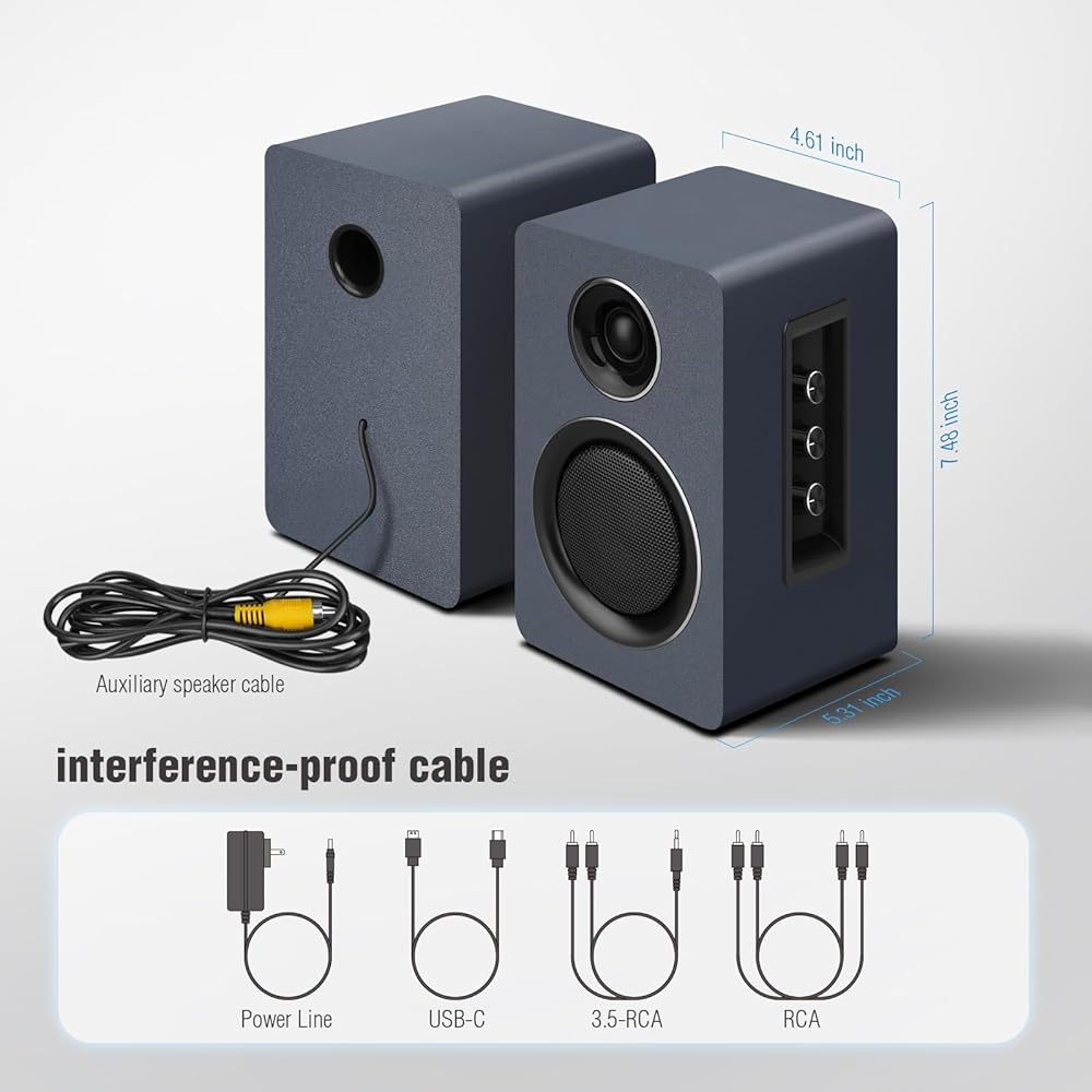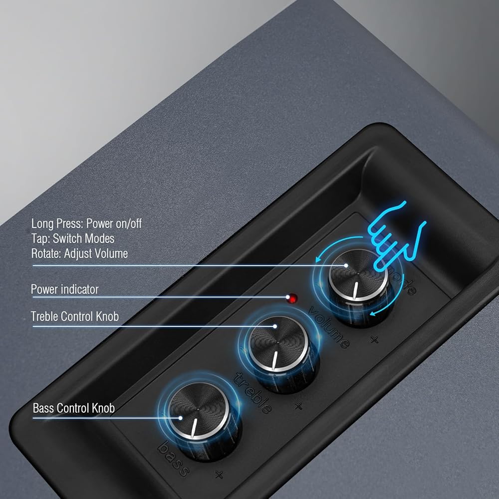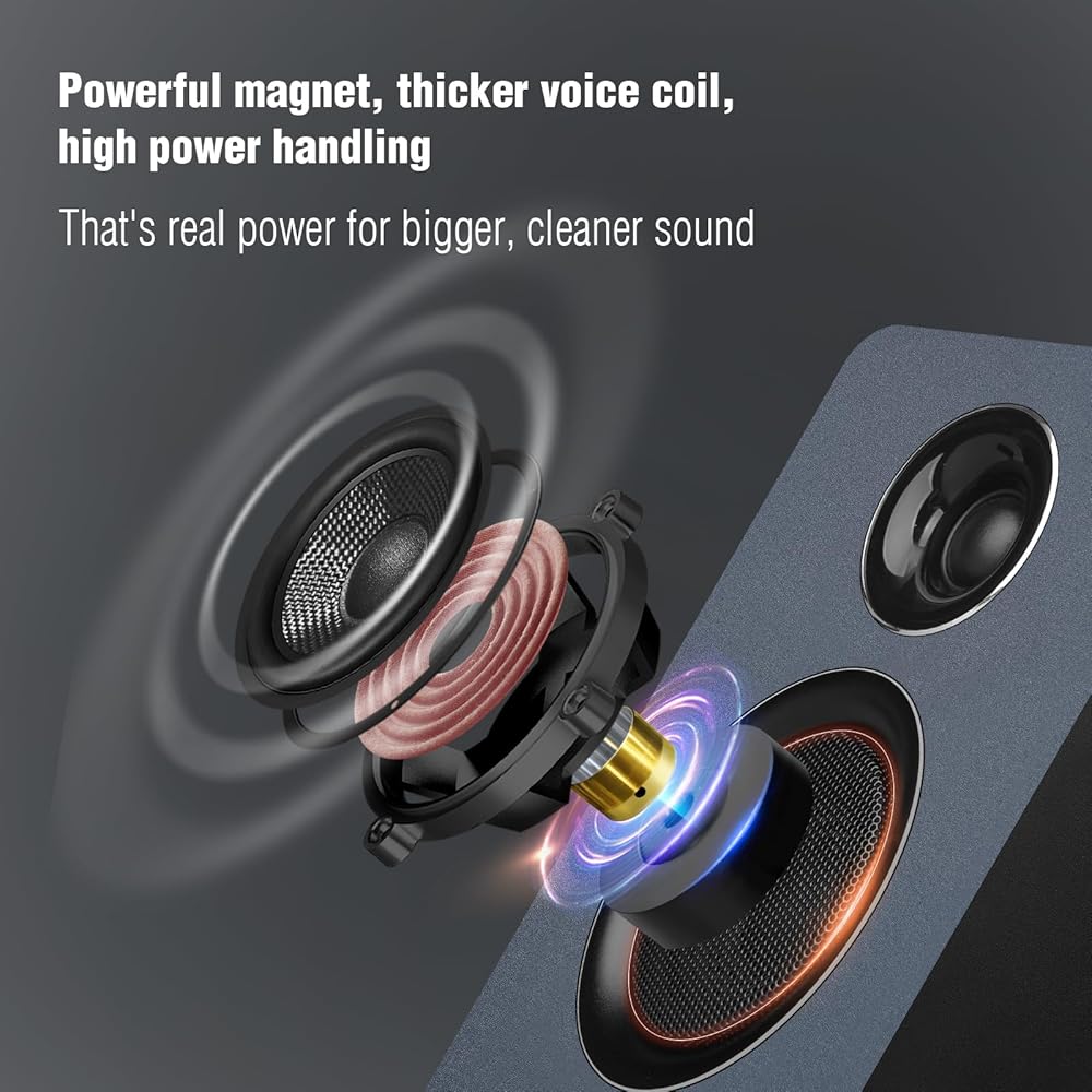 اتصال عالمي: مع مدخلات Bluetooth 5.3 وAUX/RCA وUSB-C، فإنه يتصل بسلاسة بأجهزة الكمبيوتر المكتبية وأجهزة الكمبيوتر المحمولة والأقراص الدوارة وأجهزة التلفزيون والهواتف والخلاطات وأجهزة الألعاب ومشغلات الوسائط. ارفع مستوى تجربتك الصوتية للموسيقى والألعاب والأفلام والبودكاست من خلال نقل الصوت بدرجة الاستوديو.