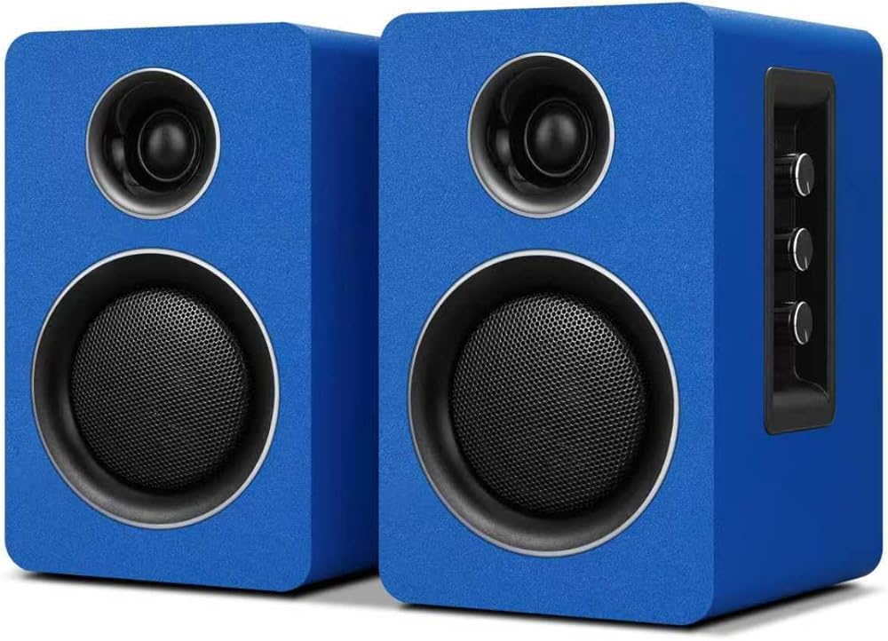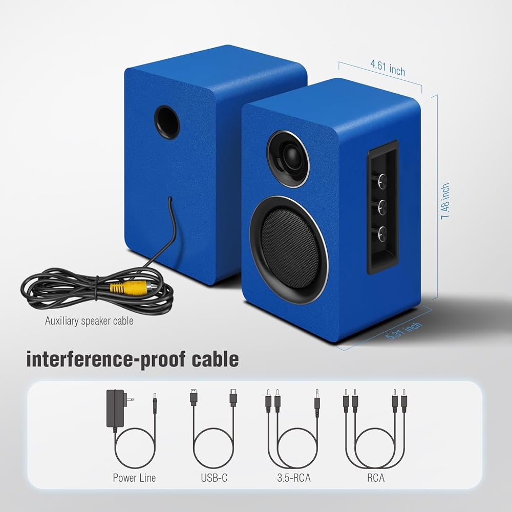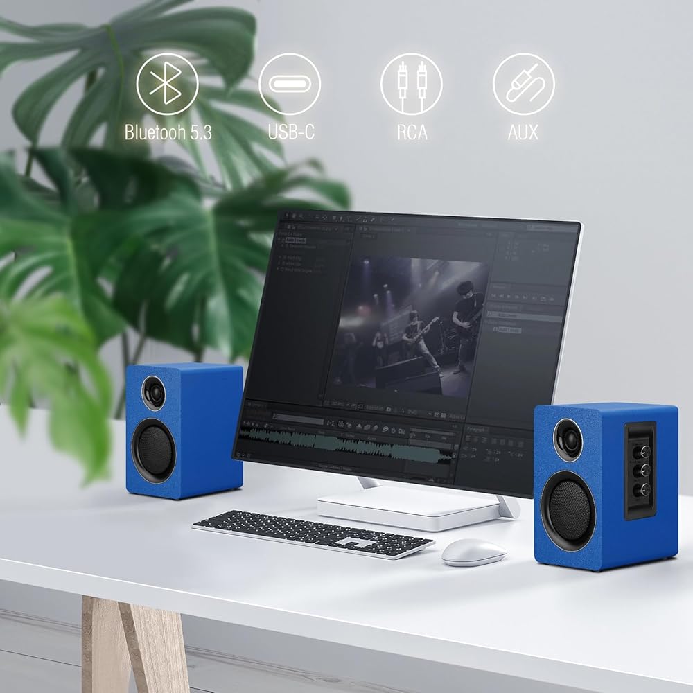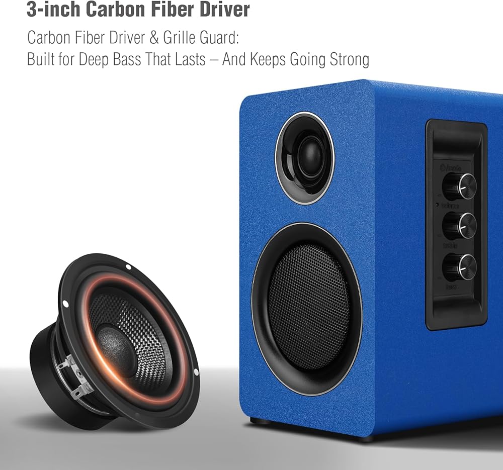 سماعات كمبيوتر للكمبيوتر المكتبي، مكبر صوت نشط على رف الكتب مع مكبر صوت من ألياف الكربون مقاس 3 بوصات ومكبر صوت بفيلم حريري، يدعم تقنية Bluetooth 5.3، ومدخل USB-C، ومدخل AUX/RCA لمشغل تسجيل التلفزيون - مجموعة ستيريو زرقاء