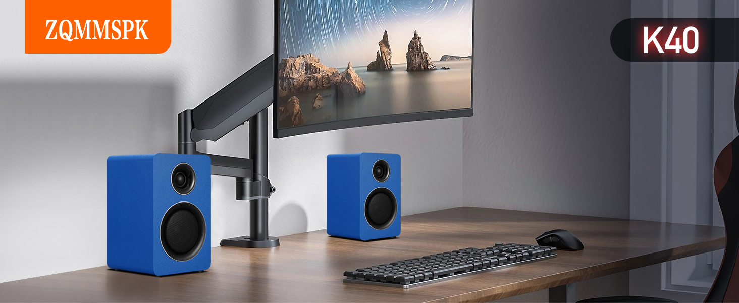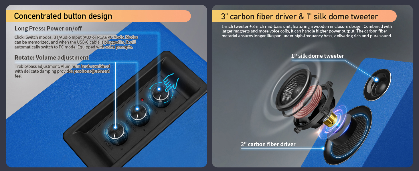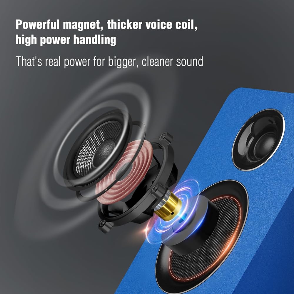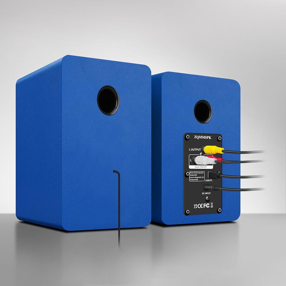 سماعات كمبيوتر للكمبيوتر المكتبي، مكبر صوت نشط على رف الكتب مع مكبر صوت من ألياف الكربون مقاس 3 بوصات ومكبر صوت بفيلم حريري، يدعم تقنية Bluetooth 5.3، ومدخل USB-C، ومدخل AUX/RCA لمشغل تسجيل التلفزيون - مجموعة ستيريو زرقاء
