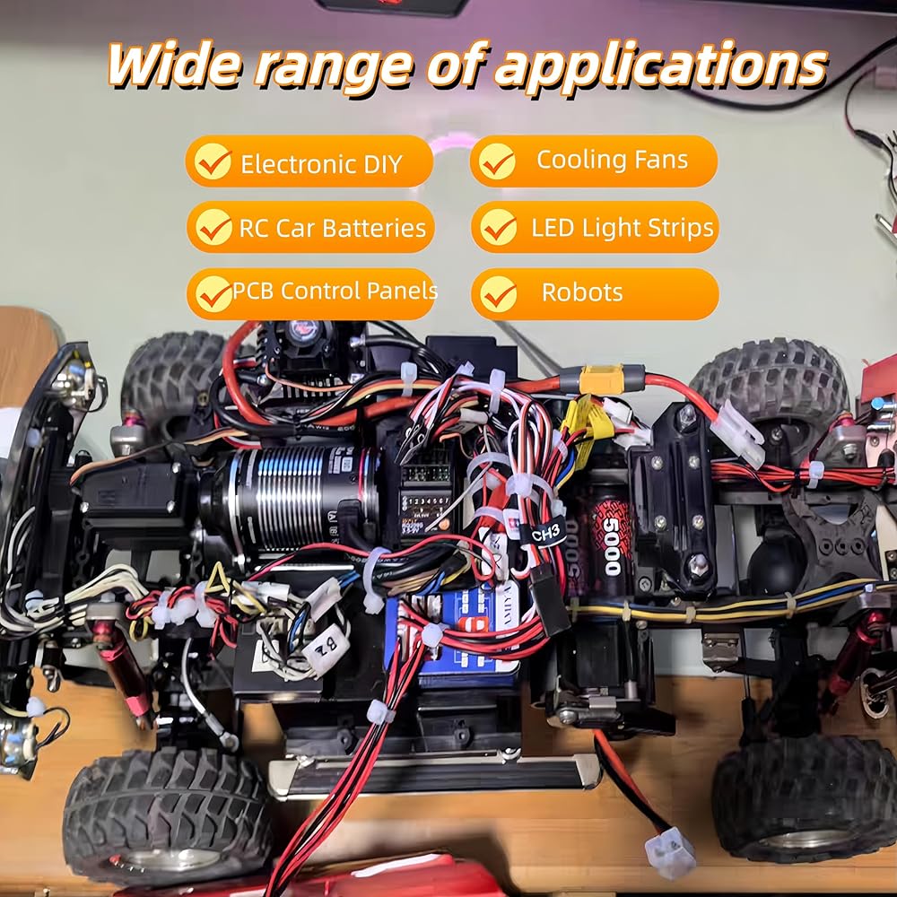 Suitable for: Electronic DIY projects, cooling fans, robots, remote-controlled car batteries, PCB control panels, speakers, LED light strips, electronic devices, lighting fixtures, toys, etc.
