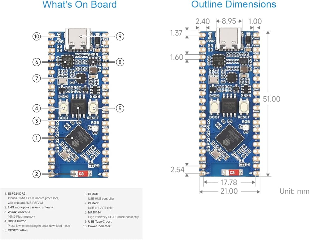 1. Adopts ESP32-S3R2 chip with Xtensa 32-bit LX7 dual-core processor, capable of running at 240 MHz