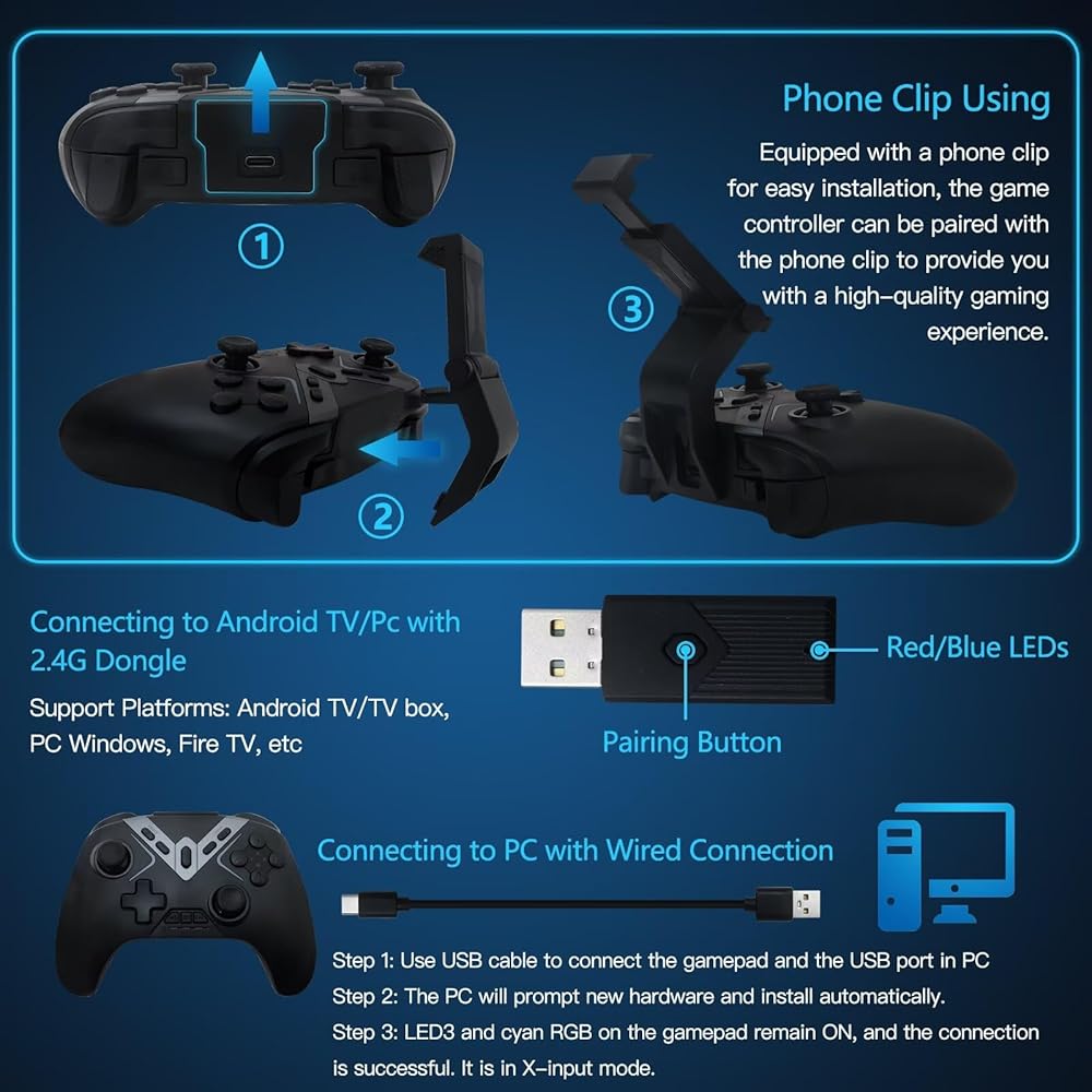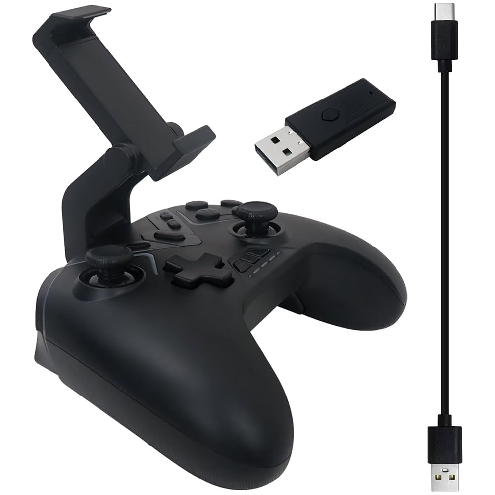 Package Included: 1x Game Controller, 1x 2.4G USB Adapter, 1x Phone Clip, 1x Type-C Cable, and 1x English Manual