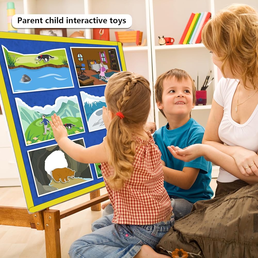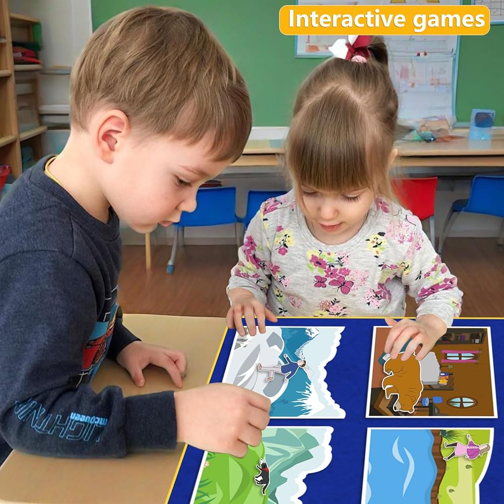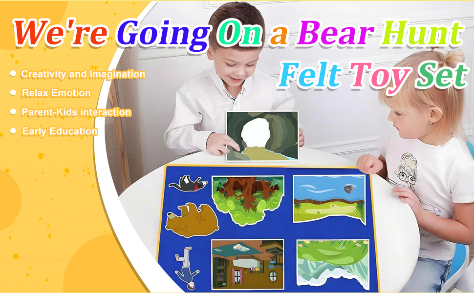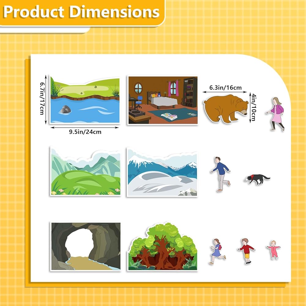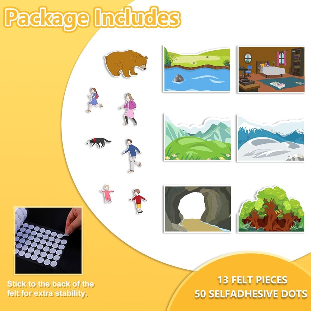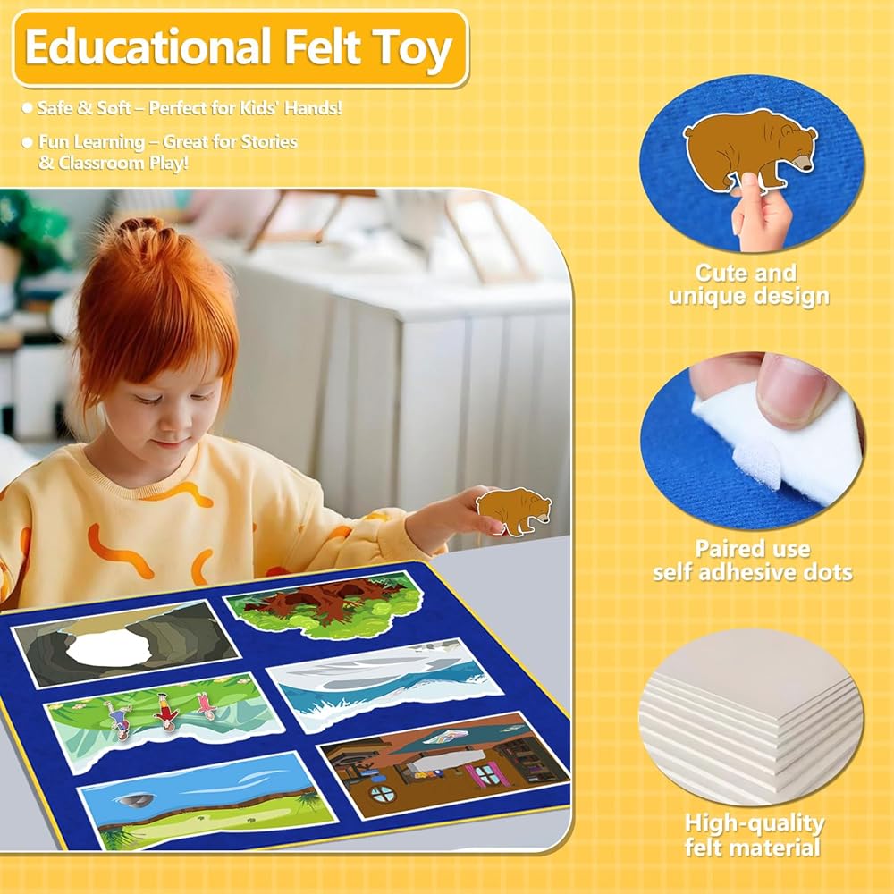 اللعب التعليمي العملي: يساعد الأطفال على بناء مهارات القراءة والكتابة والذاكرة والتسلسل المبكرة أثناء تحريك قطع اللباد خلال كل جزء من القصة، من العشب والأنهار إلى الكهوف والدببة.