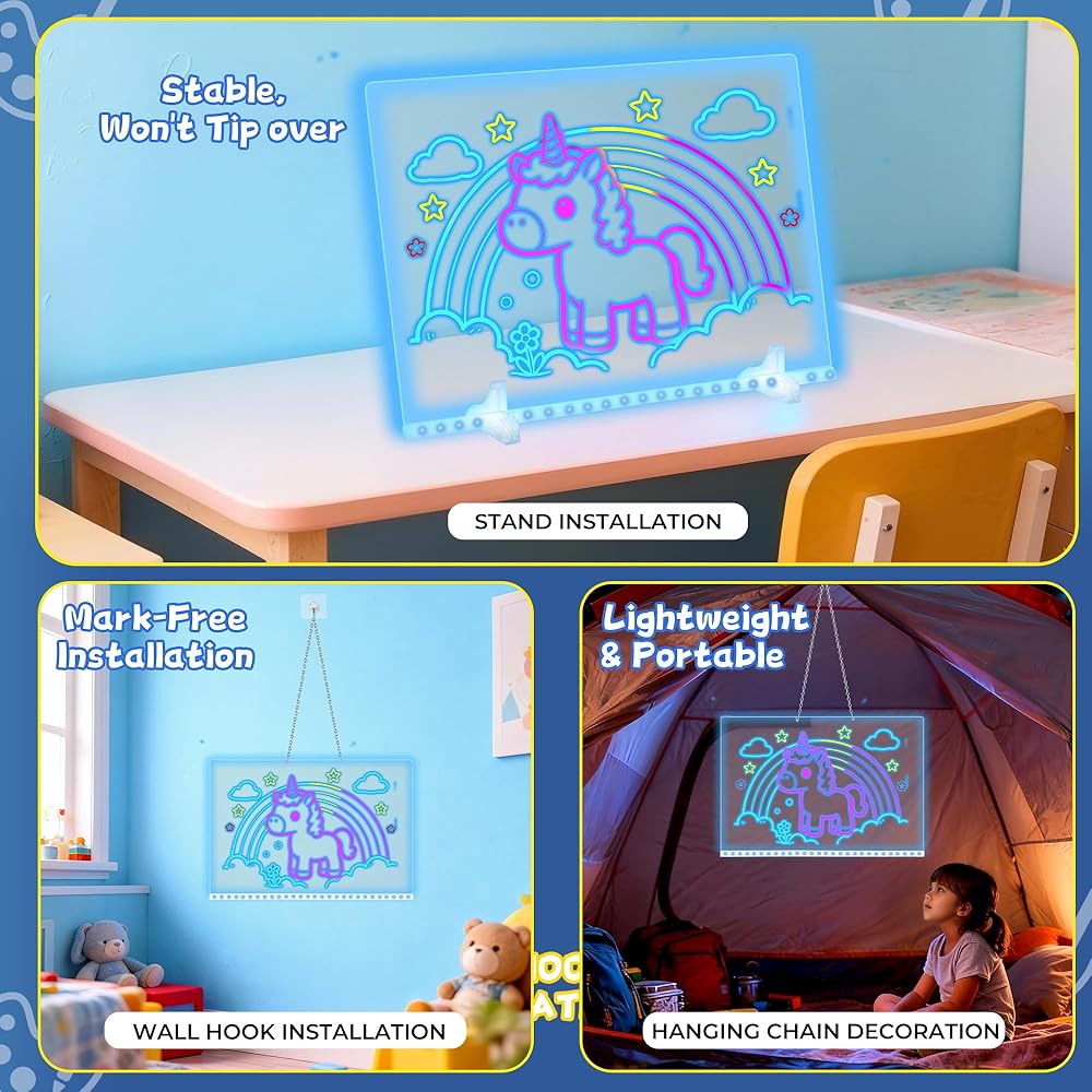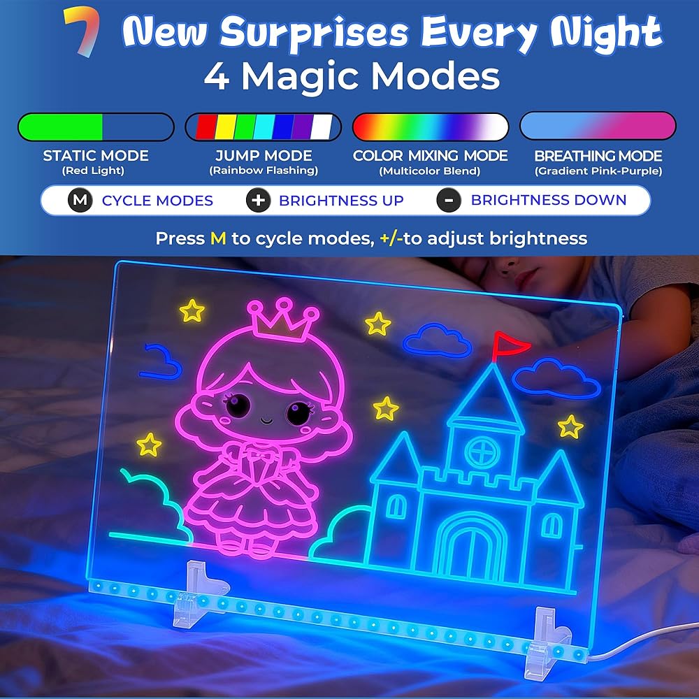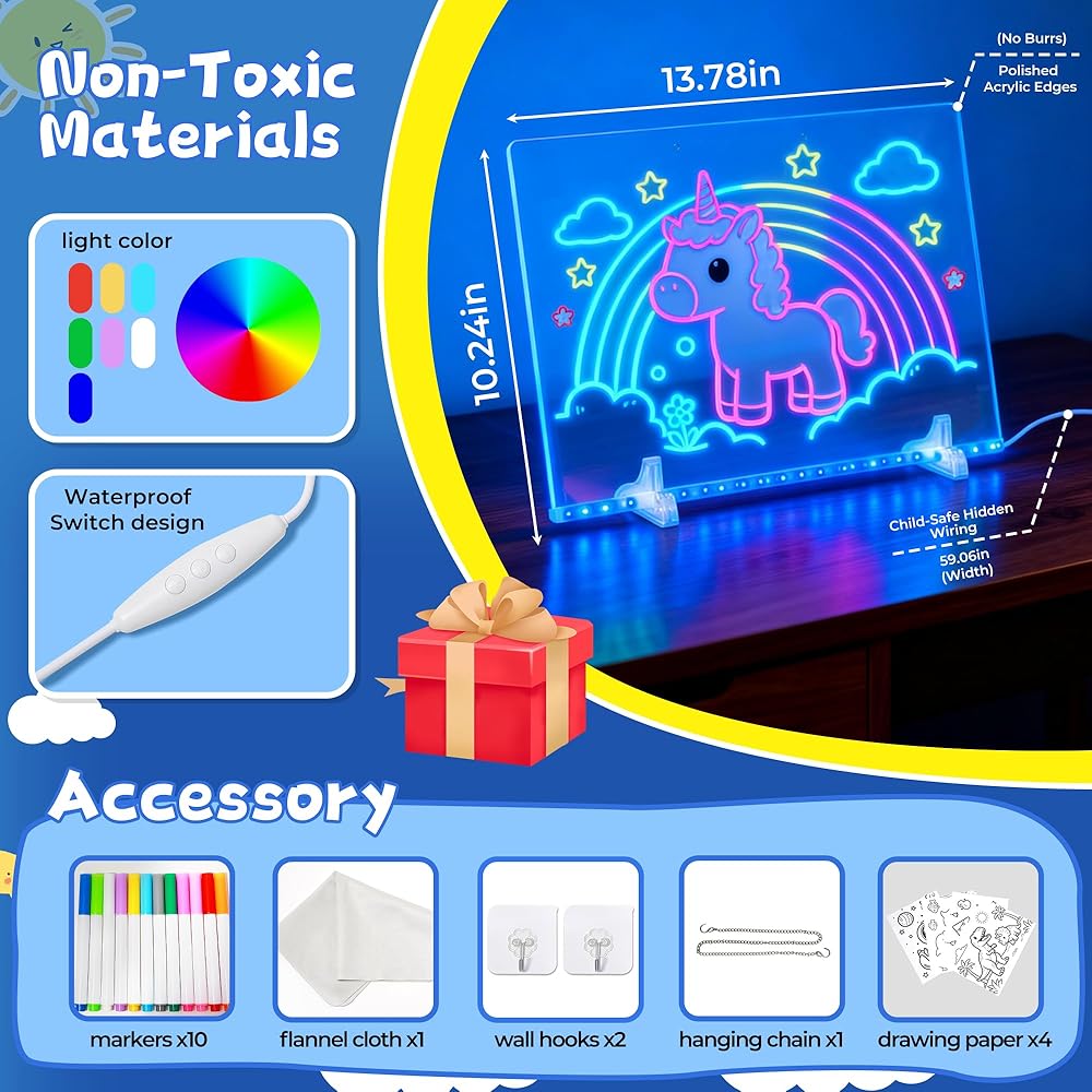 LED Note Board with 7 Colors and 10 Light Effects: Create glowing drawings, notes, and messages with a light up acrylic board that delivers a neon style glow for kids art and daily reminders