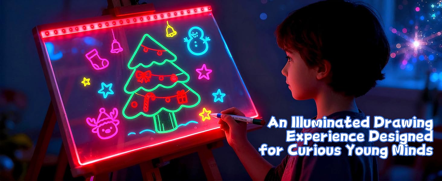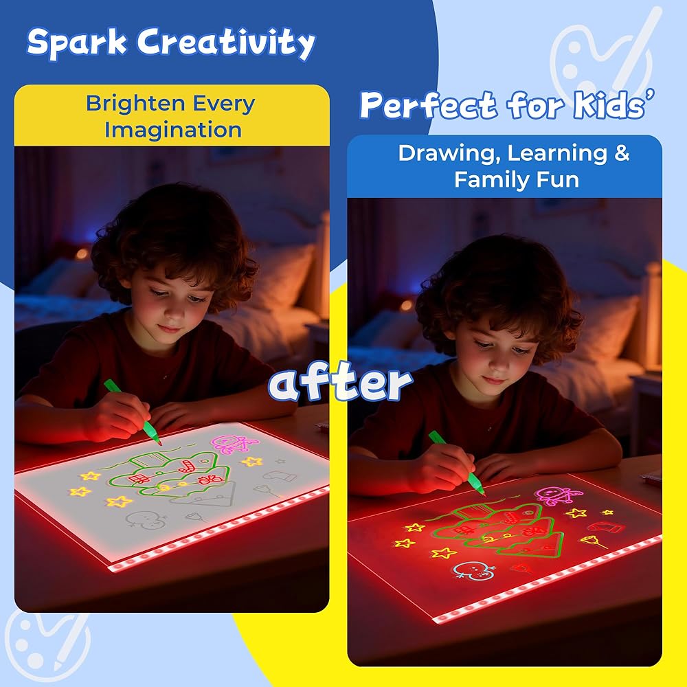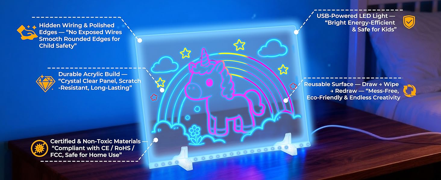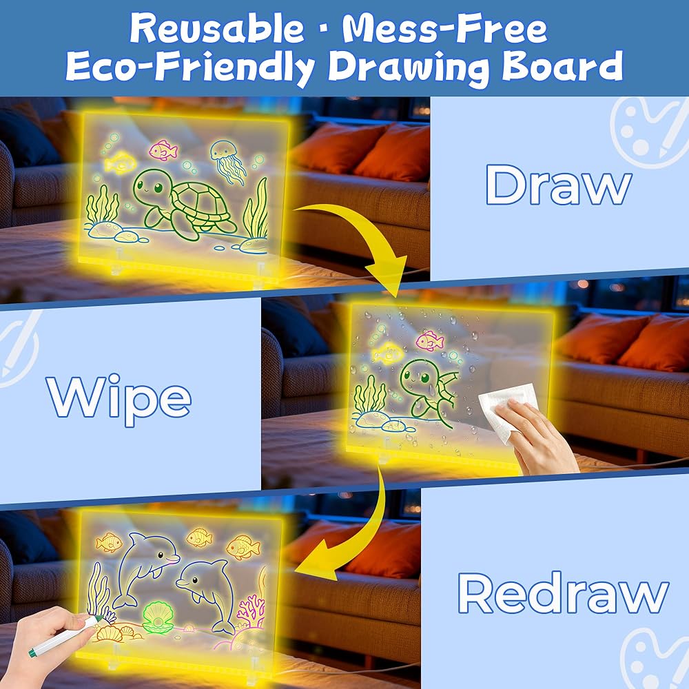 LED Note Board with 7 Colors and 10 Light Effects: Create glowing drawings, notes, and messages with a light up acrylic board that delivers a neon style glow for kids art and daily reminders