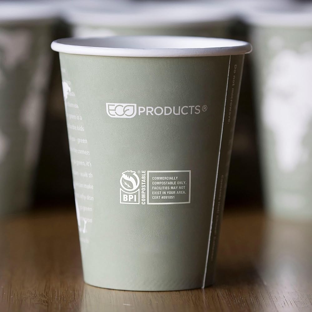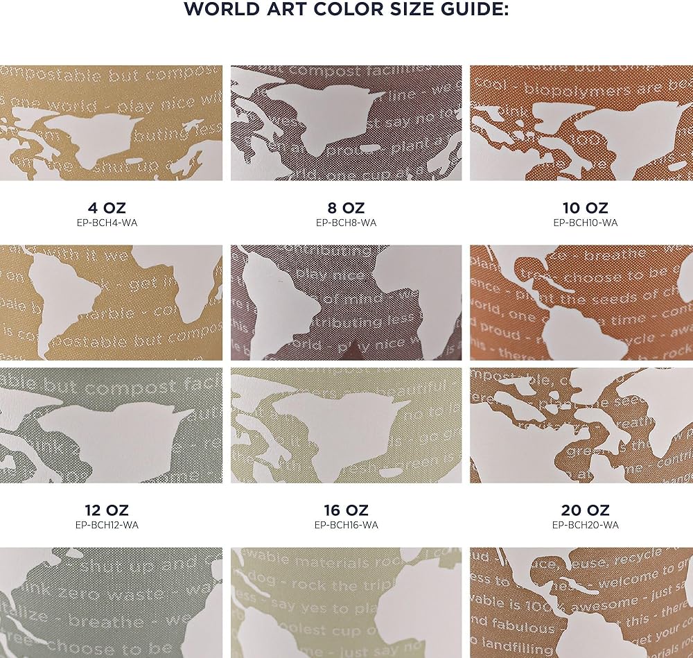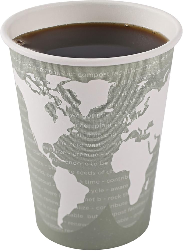Do your part to minimize waste by choosing Eco-Products World Art Renewable Compostable Hot Cups—they're lined with PLA (polylactic acid), a corn-based renewable resource. In addition to accommodating hot or cold liquids, they are compostable in a commercial composting facility.