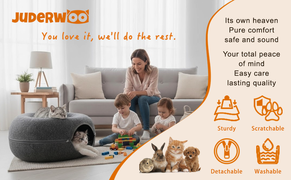 4. Easy Cleaning. The zip-open design makes hand washing fast and simple. Remove fur and dust, rinse, and air-dry—ideal for keeping your cat cave, cat wheels for indoor cats, or even a cat hiding spot fresh with minimal effort.
