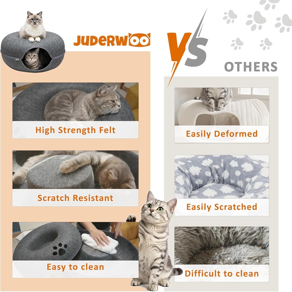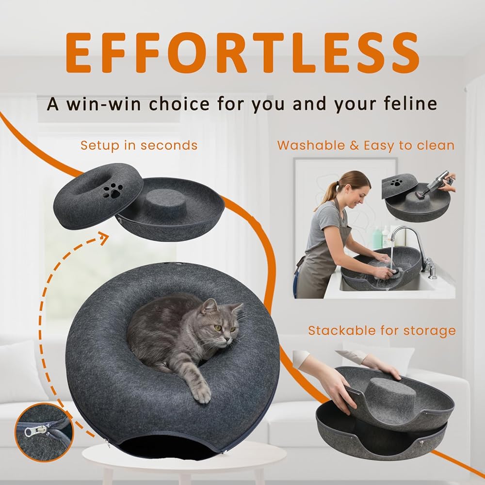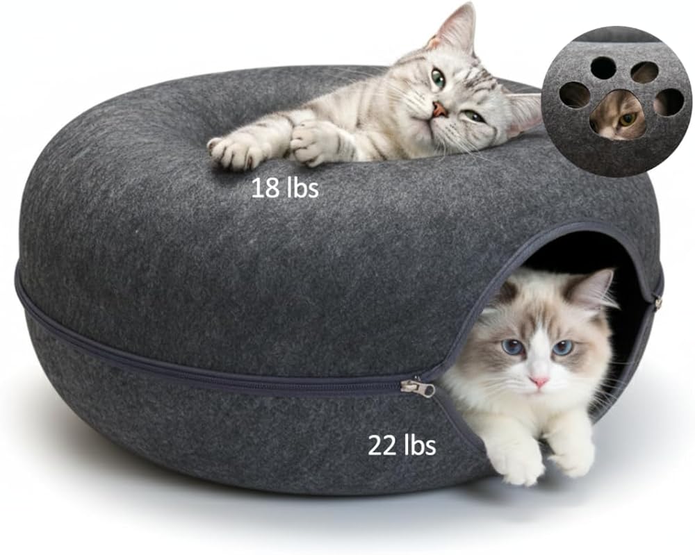1. Cozy Donut Bed & Cat Tunnel. A cute cat donut bed on top pairs with a roomy cat tunnel for indoor cats underneath—perfect for lounging, hiding, and peekaboo play. The curved donut cat bed cave gives cats a secure, calming place to rest, while the bottom peekaboo cat cave with breathable paw windows encourages natural exploration and pouncing fun.