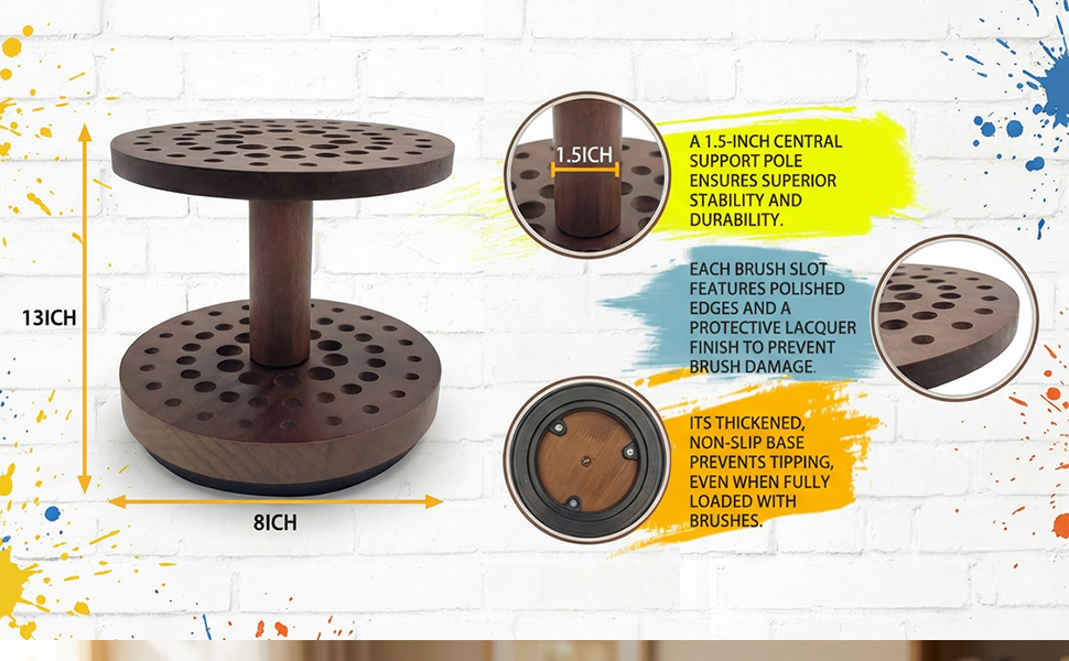 🌳 خشب صلب ممتاز - صُمم ليدوم لسنوات 📏 تخلص من البلاستيك المتشقق - حامل فرشاة الفنان هذا مصنوع من الخشب الصلب الطبيعي بنسبة 100%! مقاوم للماء، ومقاوم للخدش، وقوي ضد السقوط، ويتحمل الاستخدام اليومي. لمسة نهائية ناعمة كالحرير تحمي مقابض الفرشاة؛ قاعدة شديدة التحمل + 3 وسادات مضادة للانزلاق = صفر انقلاب. يمكن استخدامه كرف تجفيف موثوق به لفرشاة الطلاء - جودة تدوم أكثر من الخيارات الرخيصة!