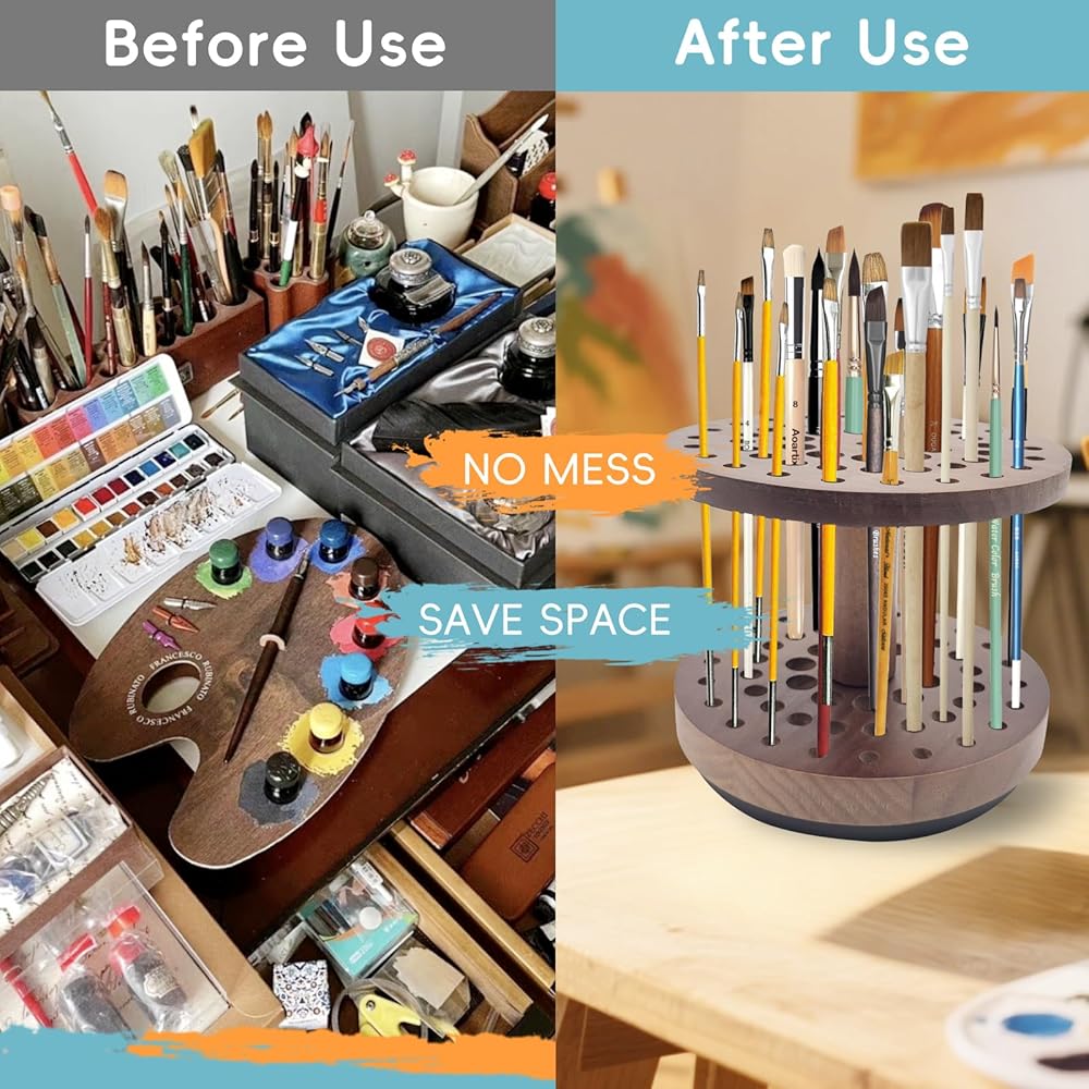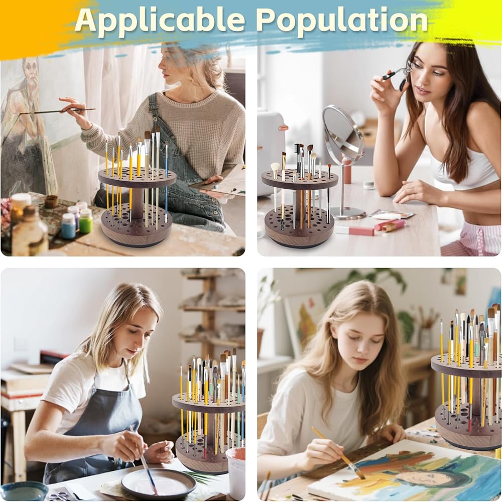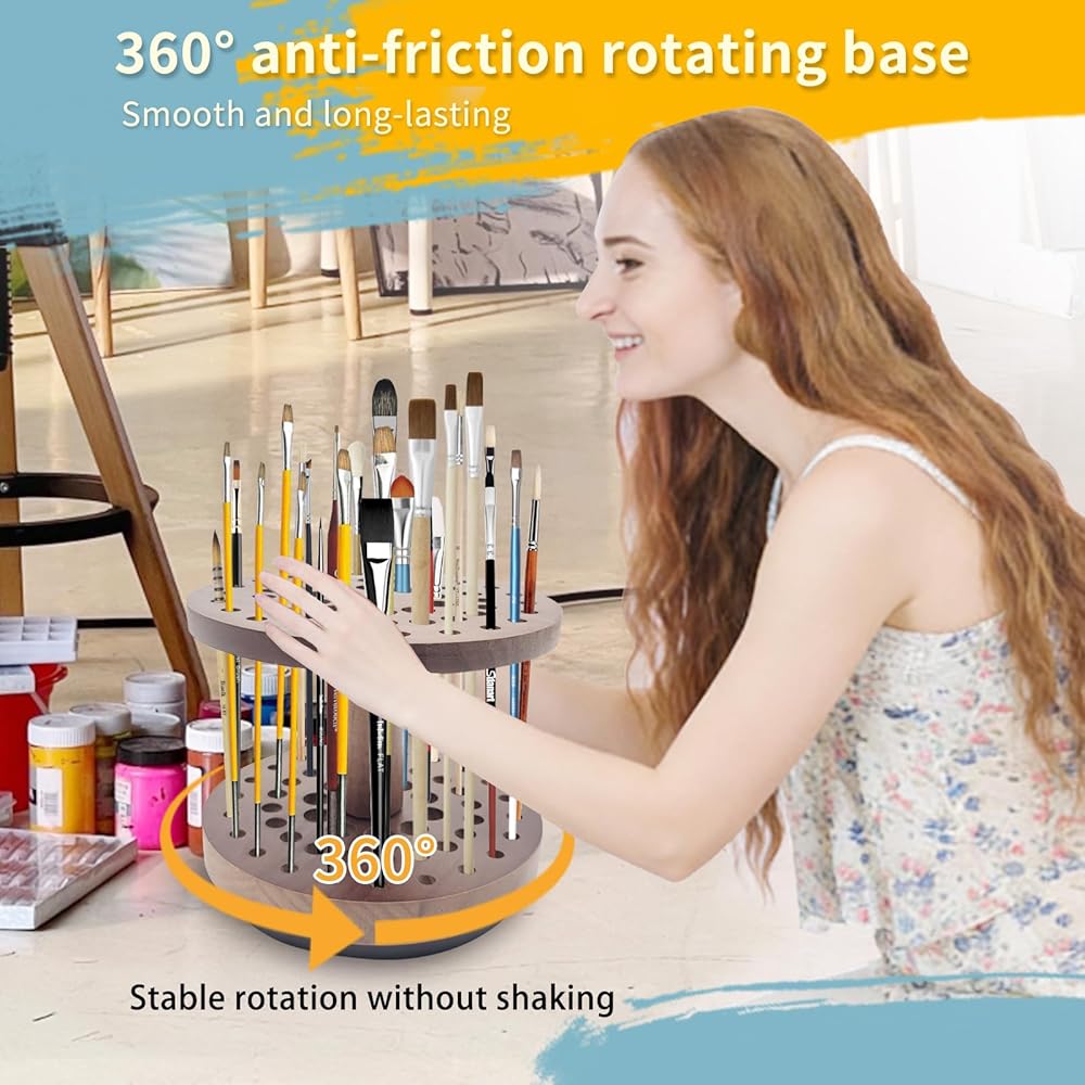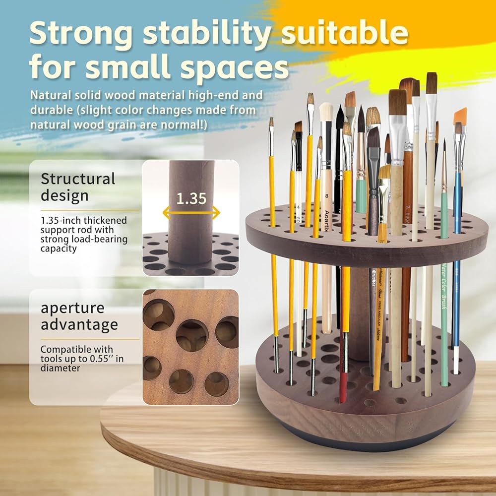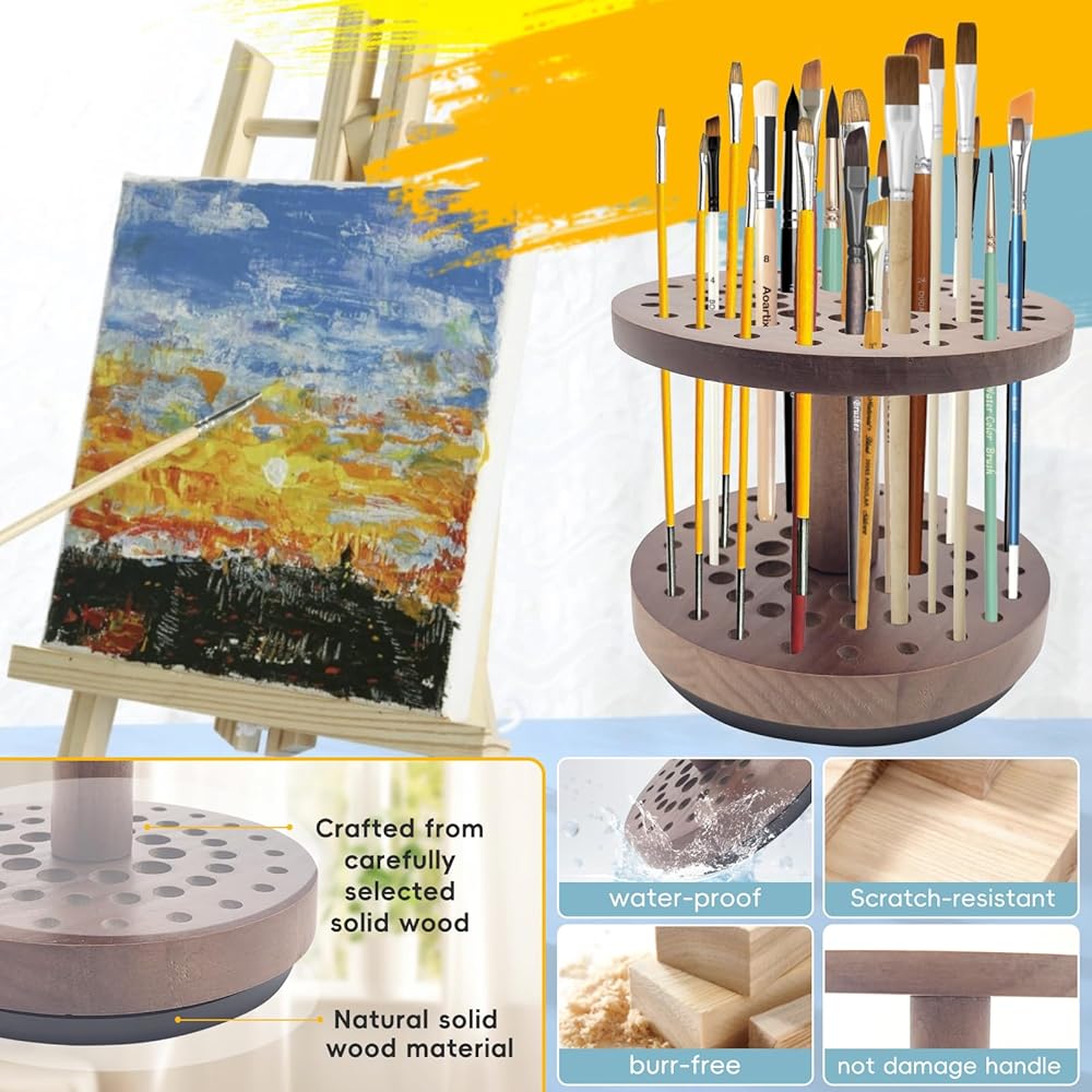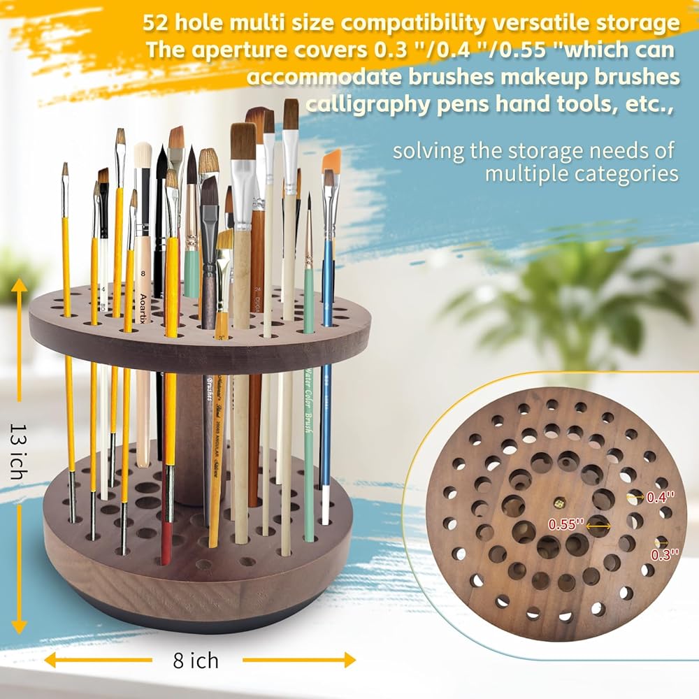 حامل فرشاة طلاء دوار بـ 52 فتحة، منظم وتخزين فرش طلاء الفنان يدور بسلاسة 360 درجة، رف تجفيف فرشاة فنية من الخشب الصلب لفرش الألوان المائية وفرش المكياج وأقلام الخط