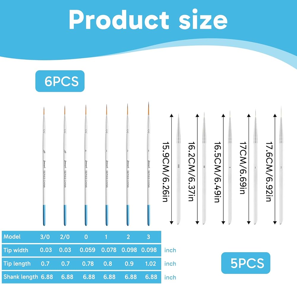 11 PCS Liner Brushes,Line Brush Set Liner Brushes for Painting, Flexible Detail Paintbrushes for Watercolor, Acrylic, Miniature Art and Model Painting, Professional Use Extremely Fine Tip Paint Brush - This fine tip paint brush offers precision for detailed artwork, ideal for intricate strokes and line work with smooth control using its rigger brush watercolor design Versatile Miniature Paint Brushes - These fine paint brushes for detail accommodate watercolor, acrylics and ink seamlessly, allowing artists to create delicate lines and textures with consistent paint flow Full Detail Paint Brush Set - This fine detail paint brush set includes multiple sizes of fine line paint brush to suit various tasks from outlining to shading, delivering excellent versatility and performance for detailed work Premium Quality and Flexibility - Constructed with high-quality nylon bristles, each fine point paint brush maintains shape and springiness for professional-grade results and smooth application every time Easy to Clean and Store - After use, wash the miniature paint brushes gently in warm water and shape the tips; their durable design ensures longevity and effectiveness for all future painting projects
