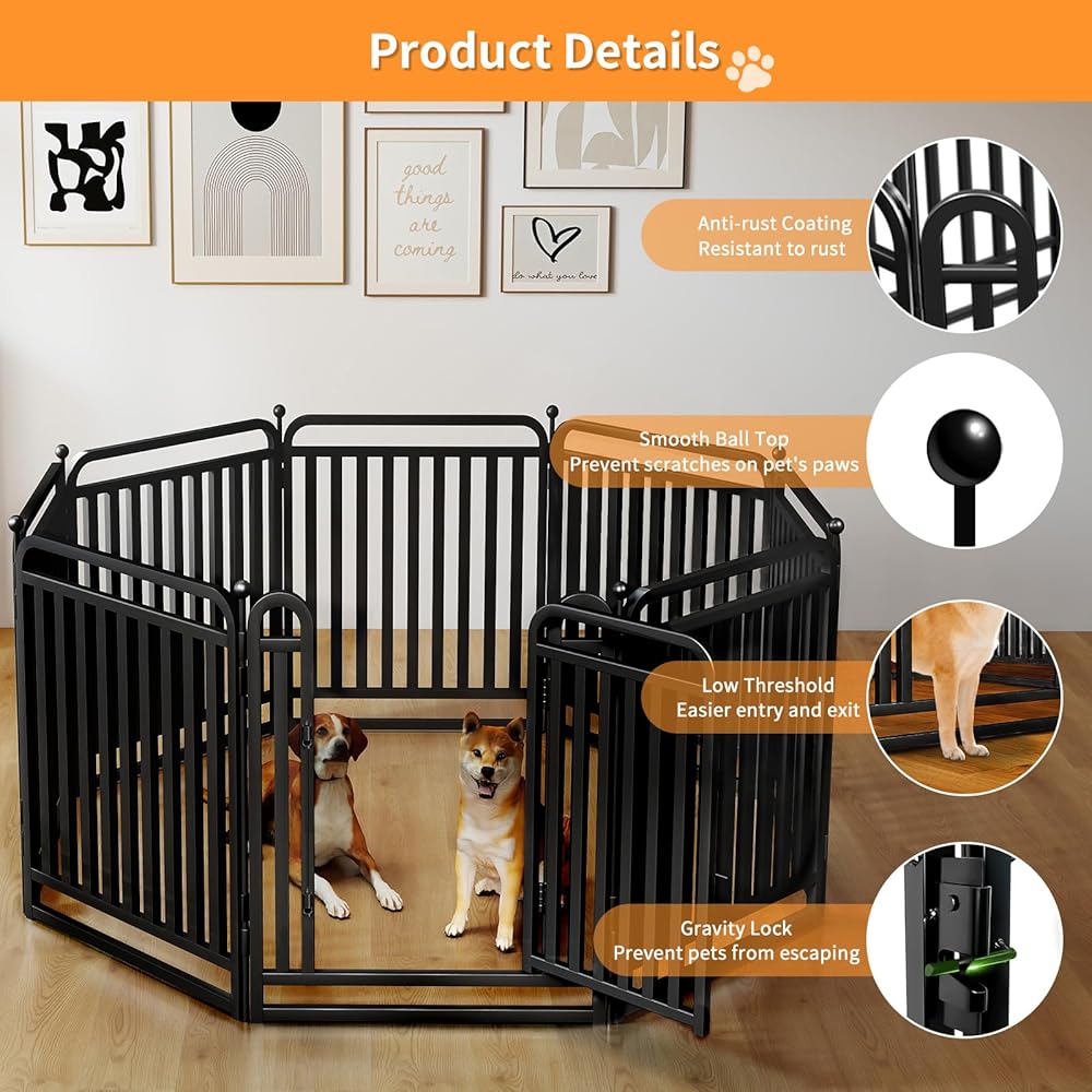 【عتبة منخفضة】يتميز قفص لعب الجراء بتصميم يدفئ القلب مع عتبة منخفضة، مما يوفر الراحة للجراء والكلاب الكبيرة للدخول والخروج من حظائر لعب الكلاب. يمكن لكلبك أن يتجاوز العتبة بسهولة بدلاً من القفز فيها، مما يمنع حيوانك الأليف من التعثر بشكل فعال. تم تصميم قلم الكلاب الخاص بنا بعناية لخلق بيئة آمنة للحيوانات الأليفة؛