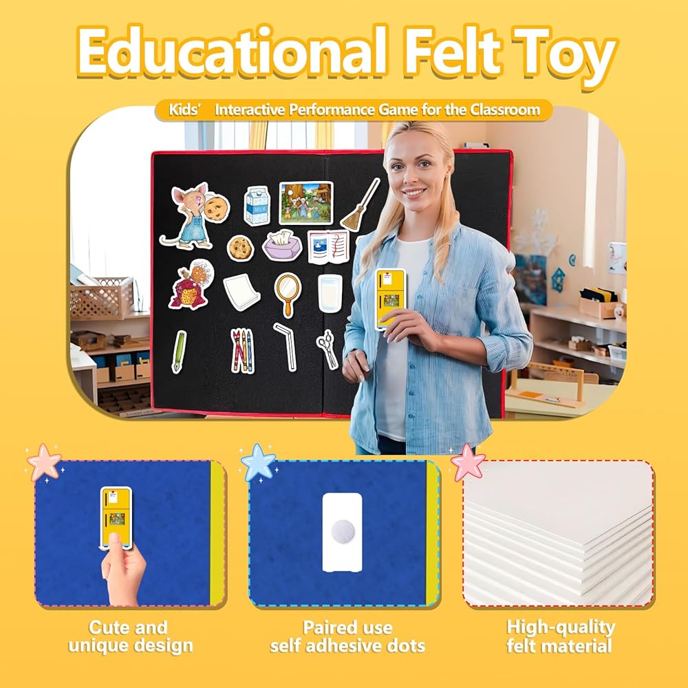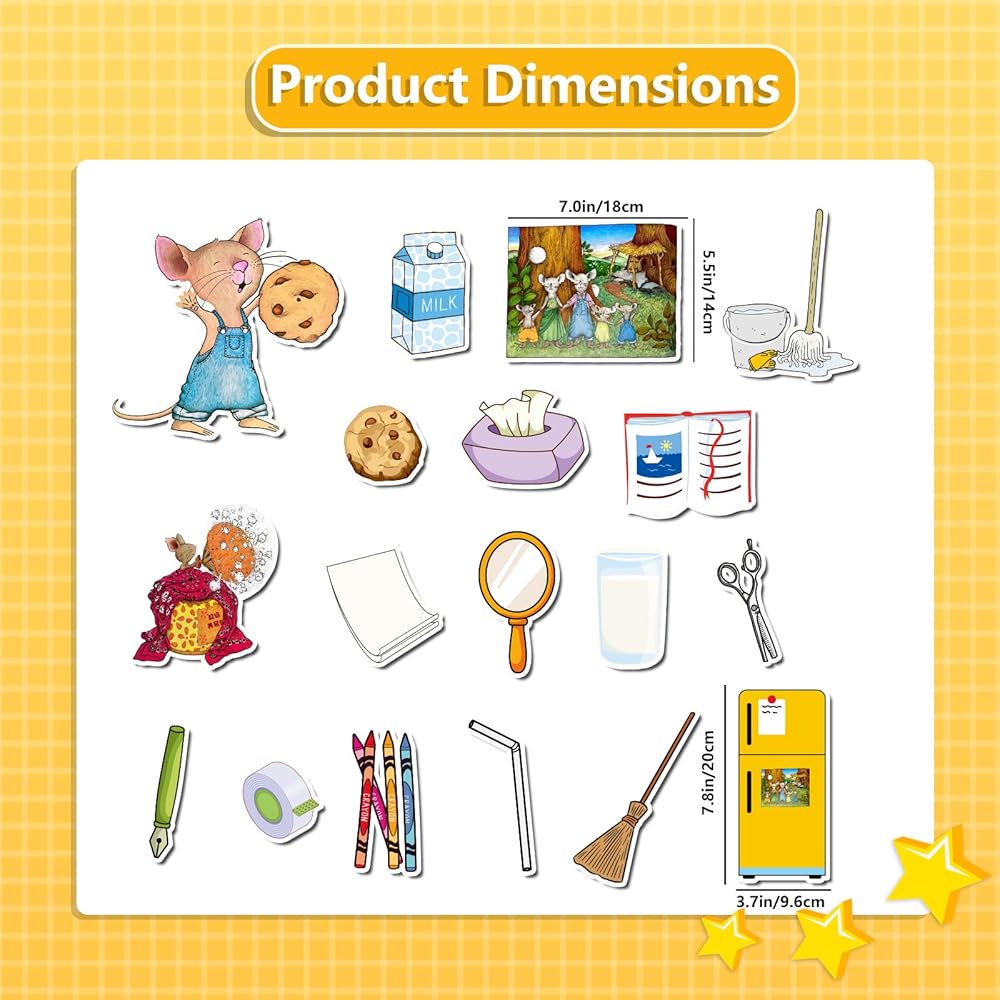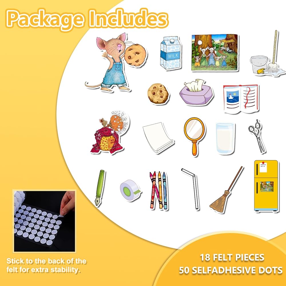 Bring storytime to life with this if you give a mouse a cookie felt board set! Inspired by the beloved children's book, this interactive flannel board is the perfect hands-on teaching tool for preschool learning activities, circle time, or homeschool fun. It encourages kids to retell the story, build sequencing skills, and use their imagination—all while having fun. The felt pieces are soft, safe, and easy for little hands to stick and remove from the board, making it great for independent play or group storytelling. This set includes everything needed to recreate the story: a mouse, a cookie, a glass of milk, a straw, a mirror, a nap, and more. Each piece is brightly colored and easy to recognize, helping children follow along with the story or make up their own version. Whether you're a teacher, parent, or homeschooler, this flannel board story set is a great way to boost early literacy skills, spark creativity, and make learning fun. A wonderful addition to your classroom must-haves or homeschool supplies!