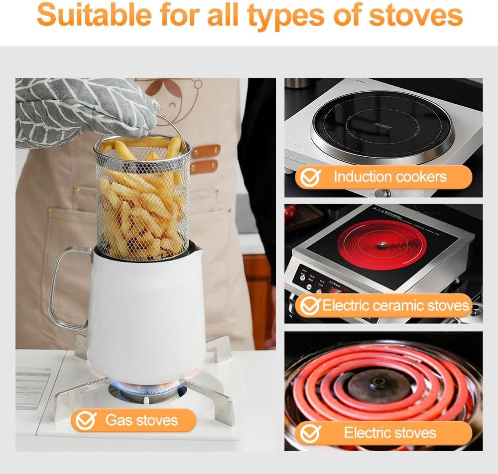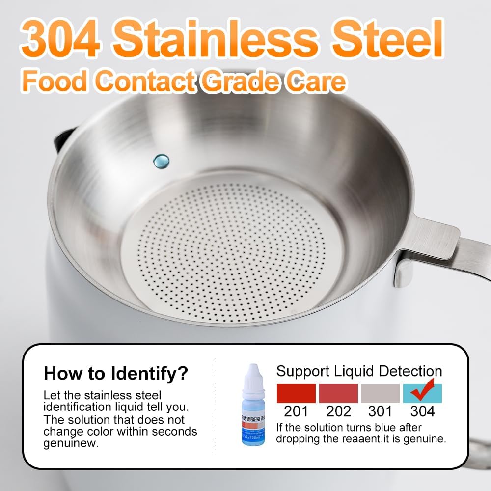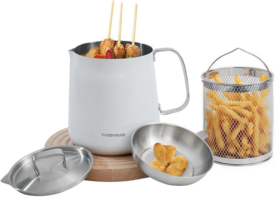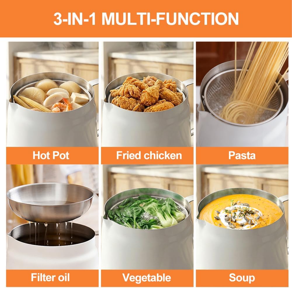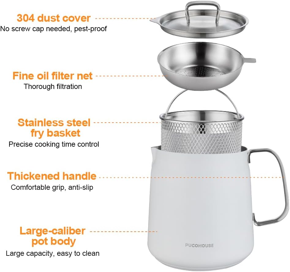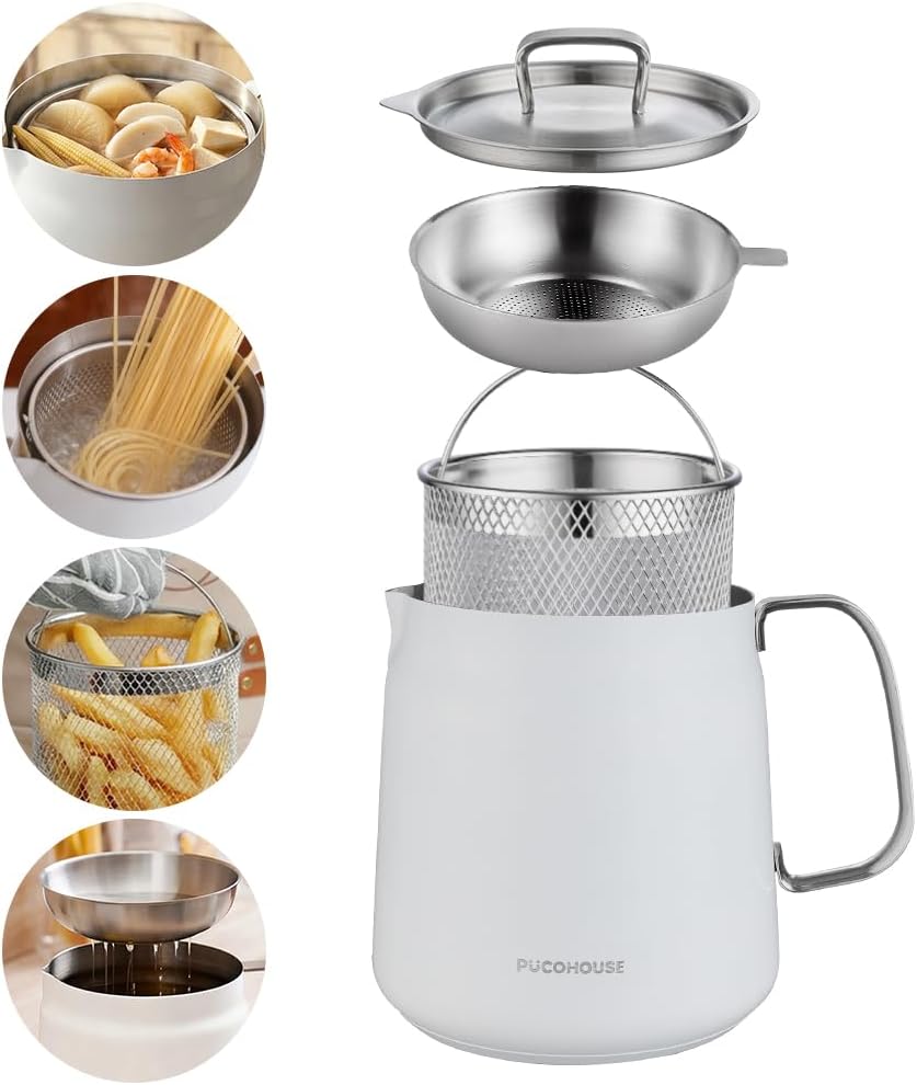 وعاء مقلاة عميقة من الفولاذ المقاوم للصدأ 304 مع سلة ومصفاة، للقلي، والطبخ، والتخييم، وحاوية فلتر الزيت، 2 لتر (أبيض)