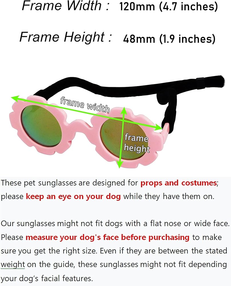 Style Vault pet sunglasses are designed for Props and Costumes. (IMPORTANT) glasses may NOT fit flat nosed or wide faced dog breeds. Please check the dimension of the sunglasses before making a purchase.
