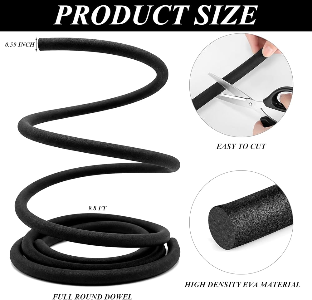 • Optimal Size for Versatility: this black foam is your go-to for crafting and cosplay projects; With its convenient size of 0.59 inches by 9.8 feet, this EVA foam stick is designed to meet a variety of needs; Say goodbye to waste and save on both money and construction time with a dependable and practical length that suits all your creative endeavors