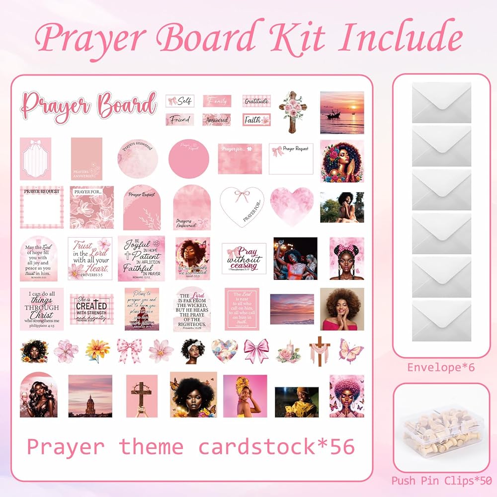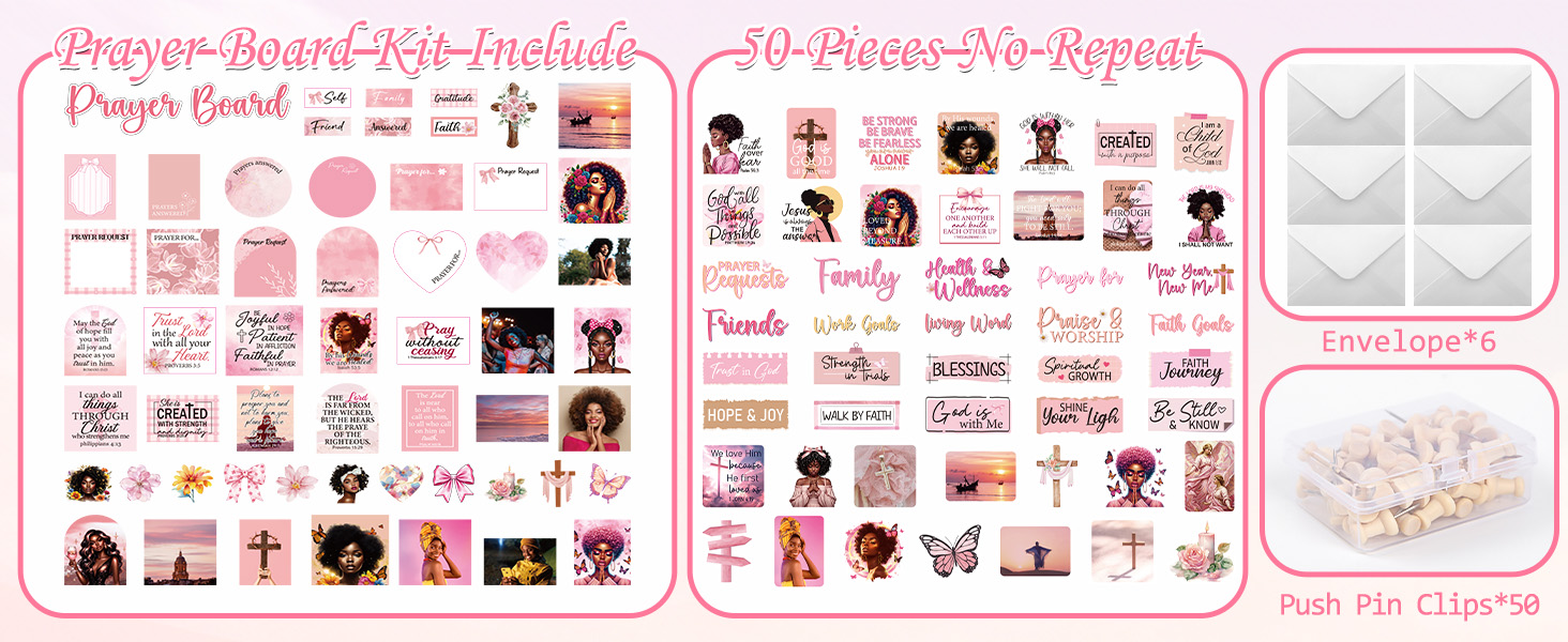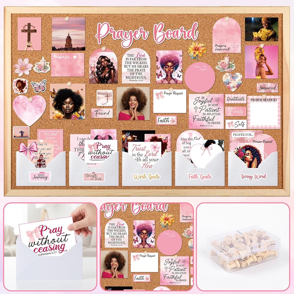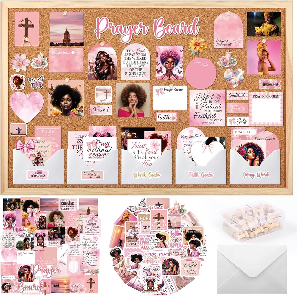 مجموعة لوحة الصلاة للنساء السود - 162 قطعة من ملصقات لوحة الصلاة من Vemfare مع دبابيس ومغلف وبطاقات اقتباسات لآية الكتاب المقدس، وملصقات سجل القصاصات الوردية، ومستلزمات دراسة الكتاب المقدس للنساء (وليس لوحة الفلين)