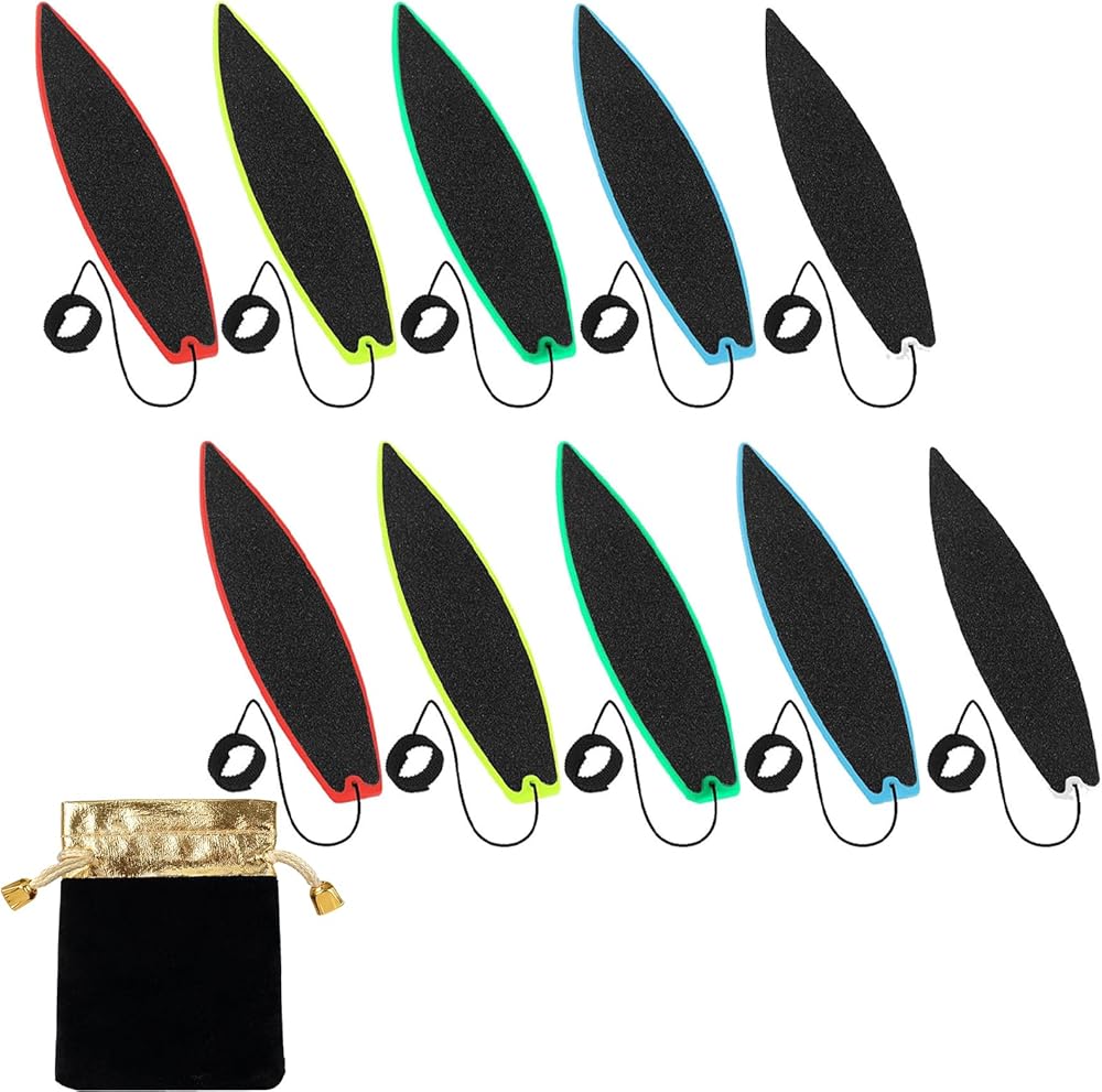 Complete Finger Surfboard Set: Includes 11 colorful mini surfboards in blue, green, yellow, red and white colors; Comes with a convenient storage bag for organization and portability; These plastic finger boards provide engaging entertainment for various settings; Perfect for finger dexterity development and creative expression; Mini skateboards for fingers offer smooth gliding action on flat surfaces