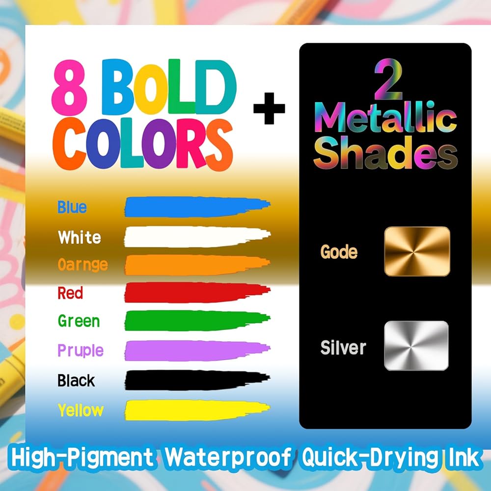 Includes 8 vivid solid shades + 2 metallic colors.
