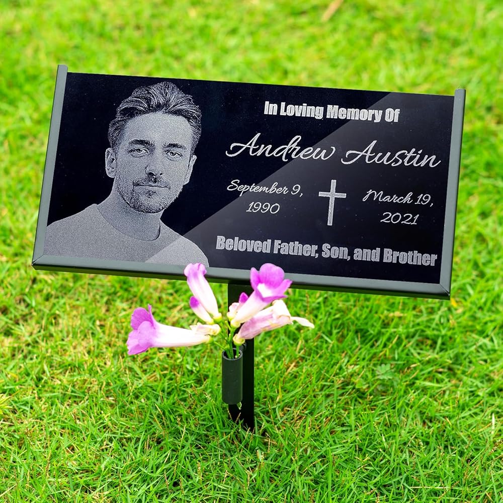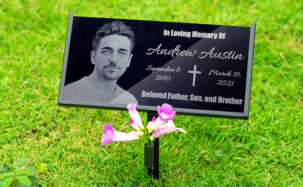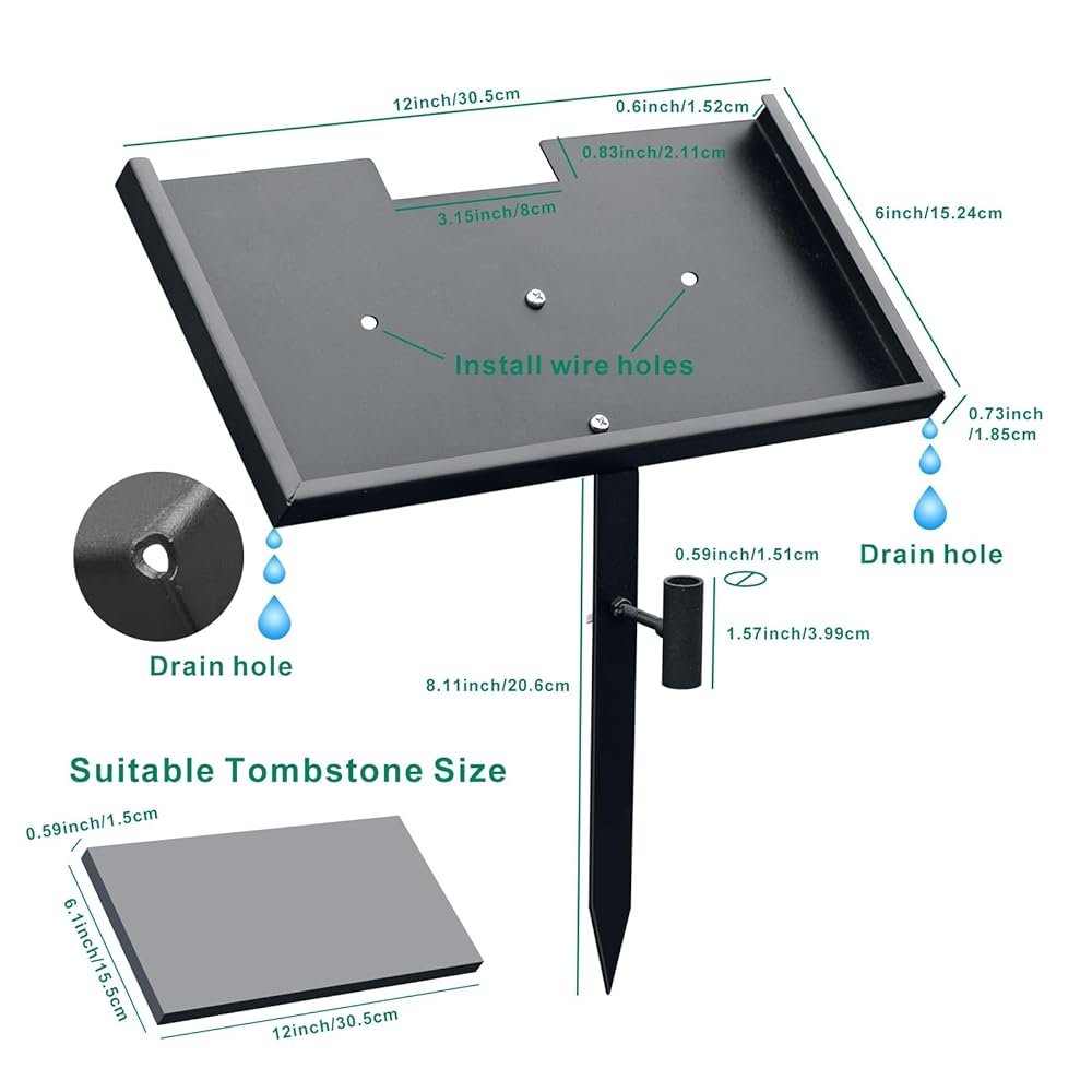 يتم ربط الأنبوب القابل للإزالة الموجود على حامل حجر الرأس بالحامل ويمكن استخدامه لتزيين اللوحة التذكارية، ويمكنك إضافة الزهور أو غيرها من الديكورات (الزهور غير متضمنة) لإضافة تفاصيل جميلة إلى حجرك التذكاري.