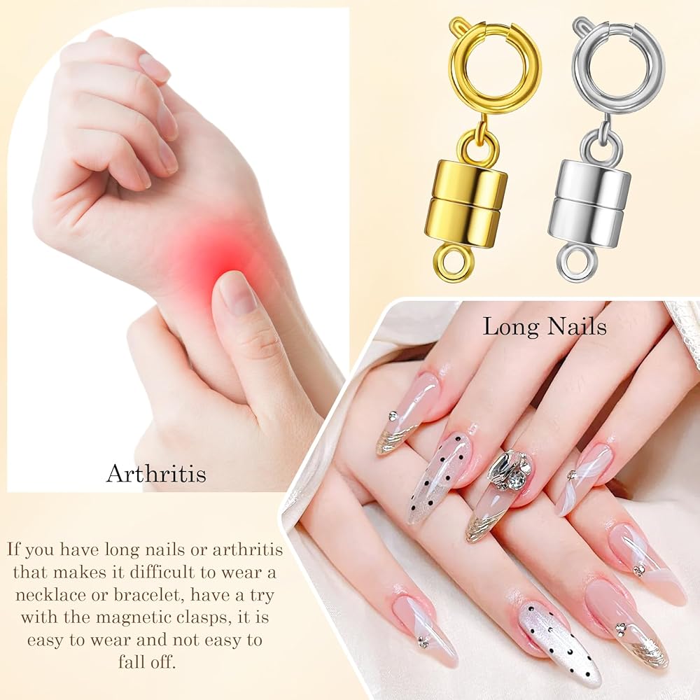 مشابك مغناطيسية رائعة: إذا كان لديك أظافر طويلة، أو التهاب المفاصل، أو حركة أصابع محدودة، فإن المشابك المغناطيسية والإغلاقات الخاصة بنا هي الحل الأمثل. يمكنك بسهولة ارتداء مجوهراتك بنفسك، دون الحاجة إلى مساعدة الآخرين. وهذا لا يحمي أظافرك ويديك فحسب، بل يزيل أيضًا المتاعب والإحباط. جربها ودع هذه المشاكل تتوقف عن إزعاجك.