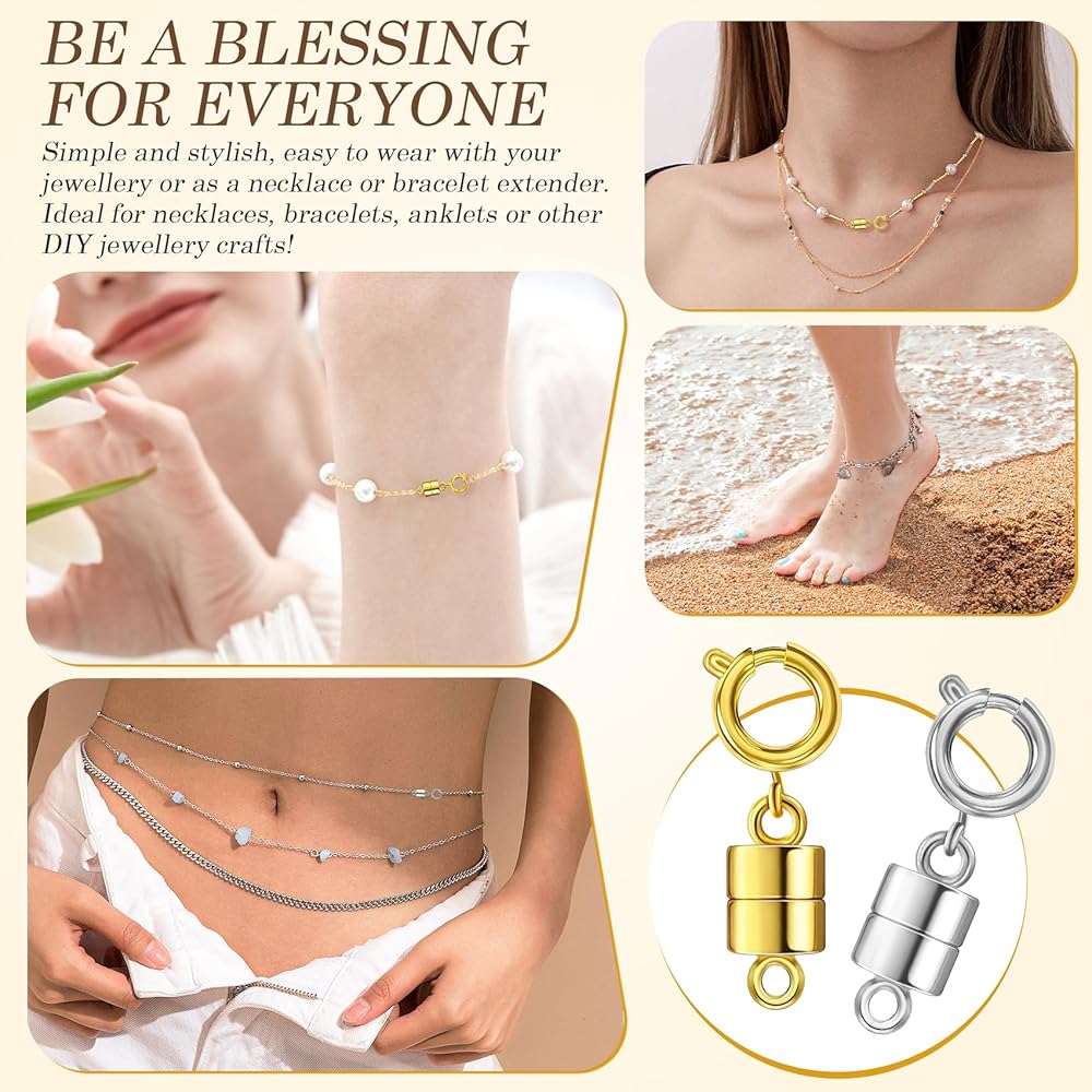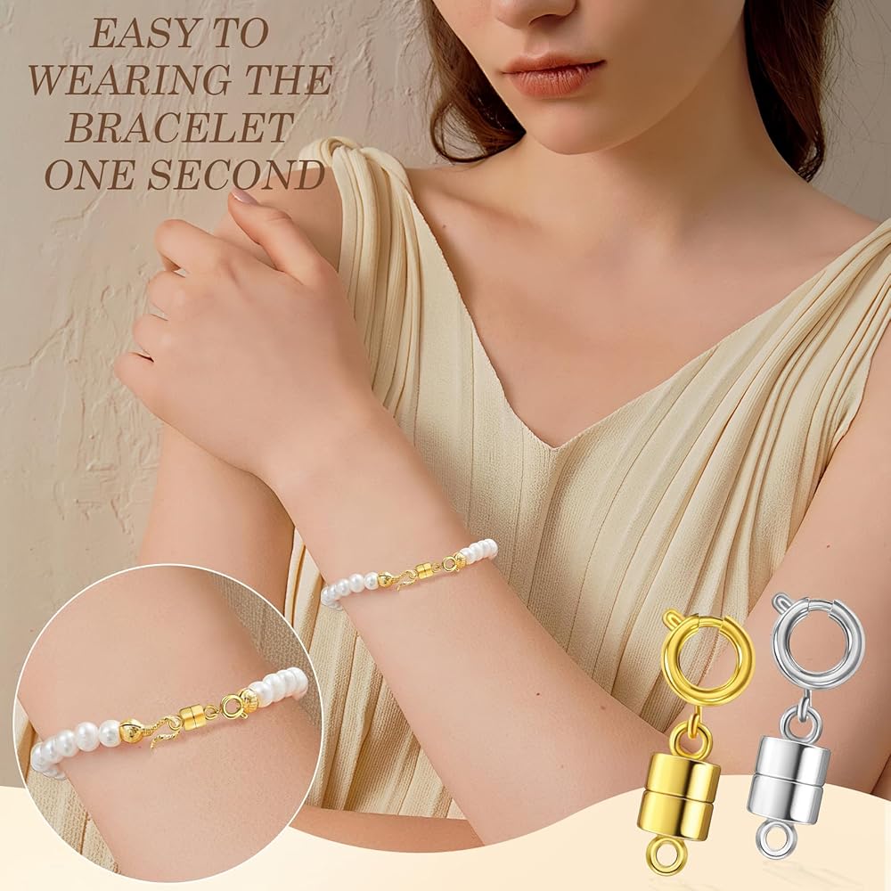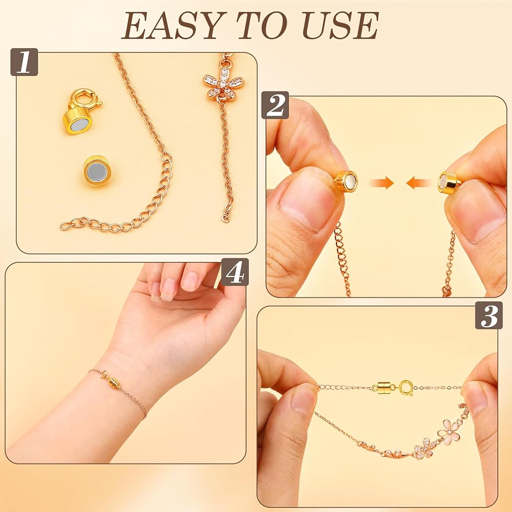 سهلة الاستخدام: مشابك القلادة المغناطيسية تحرر يديك بقوتها المغناطيسية القوية، مما يسمح لك بربط الأساور أو القلائد دون عناء. يستغرق التثبيت والإزالة ثوانٍ فقط، مما يجعل حياتك أكثر راحة وروتين جمالك دون عناء.