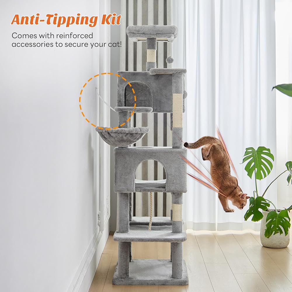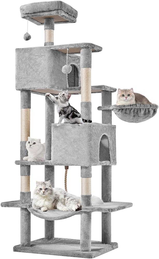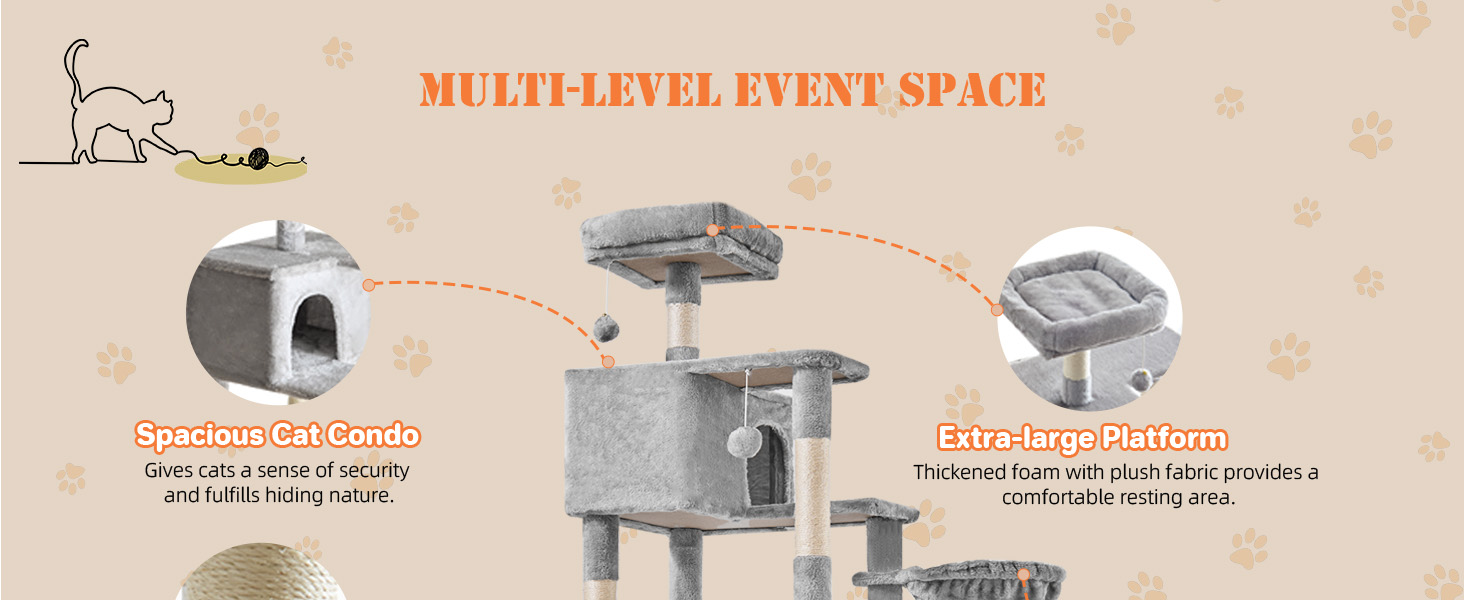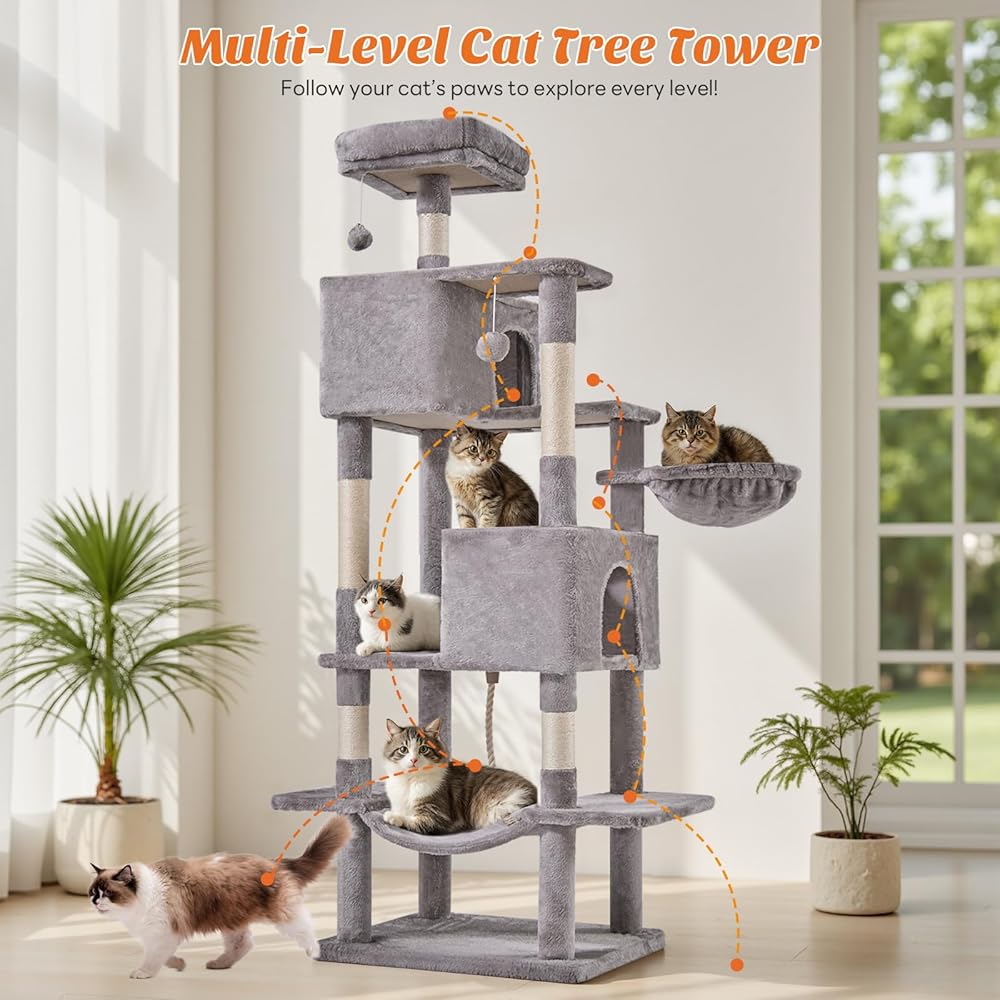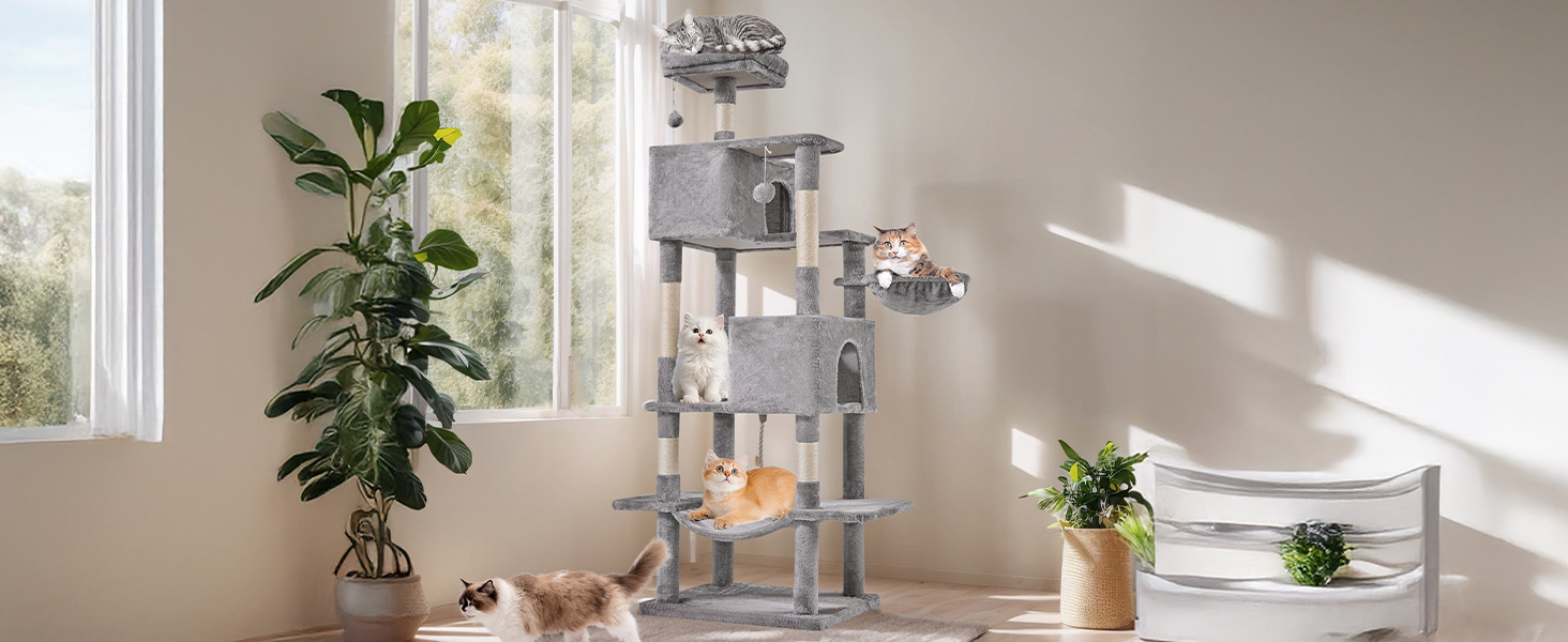 هيكل متعدد الطبقات - تتميز شجرة القطط KMFurnila مقاس 66 بوصة بوجود مجثمين علويين فاخرين، وشقتين واسعتين للقطط، ومستويات نشاط متعددة، مما يخلق ملعبًا عموديًا مثيرًا. إنها مثالية لـ 3-4 قطط تزن كل منها حوالي 13 رطلاً للعب والتسلق والقيلولة ومراقبة المناطق المحيطة بها بشكل مريح.