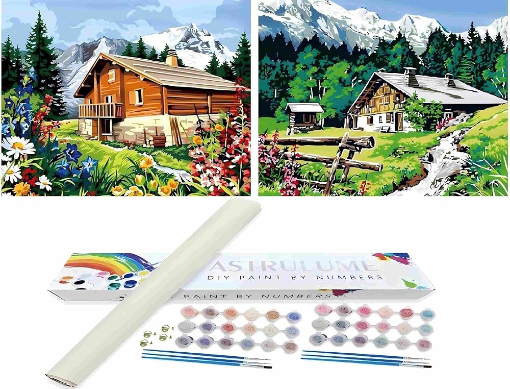 مجموعة الطلاء بالأرقام للبالغين: تتضمن المجموعة الأدوات اللازمة للرسم - مجموعتين من اللوحات القماشية الشفافة المطبوعة مسبقًا (بدون إطارات)، وطلاءات أكريليك عالية الجودة، وفرش بأحجام مختلفة، ودليل ورقي مرقم لسهولة الرجوع إليه، وجميع المكونات معبأة بعناية في صندوق ملون