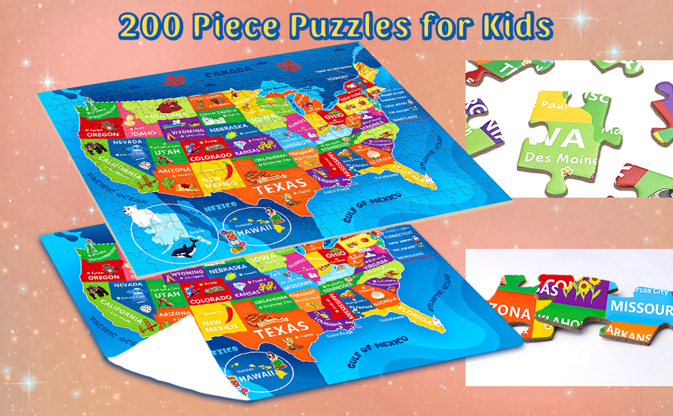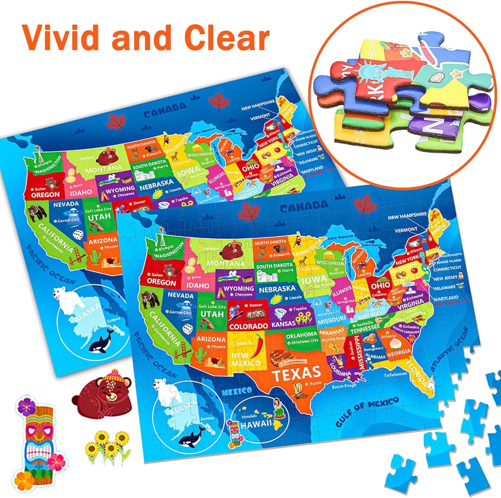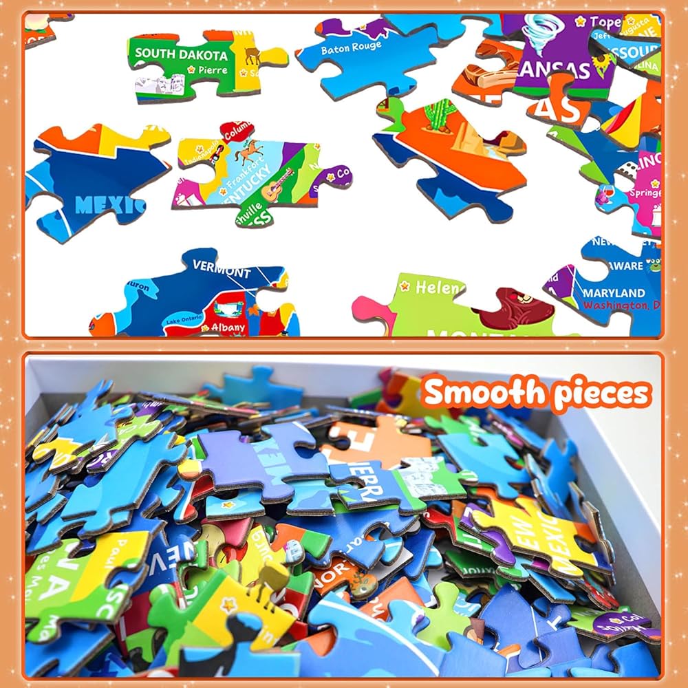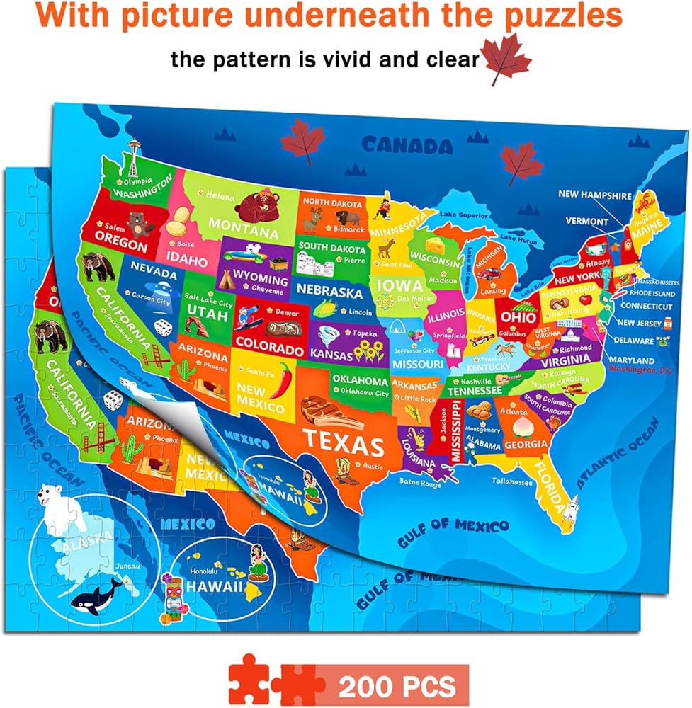 لغز خريطة الولايات المتحدة للأطفال الذين تتراوح أعمارهم بين 6-8 8-10 10-12 - 200 قطعة من الصور المقطوعة الأرضية مع ملصق - منشار جغرافي تعليمي للولايات المتحدة الأمريكية مع 50 دولة وعواصم - لغز خريطة كبير هدية STEM للأولاد والبنات