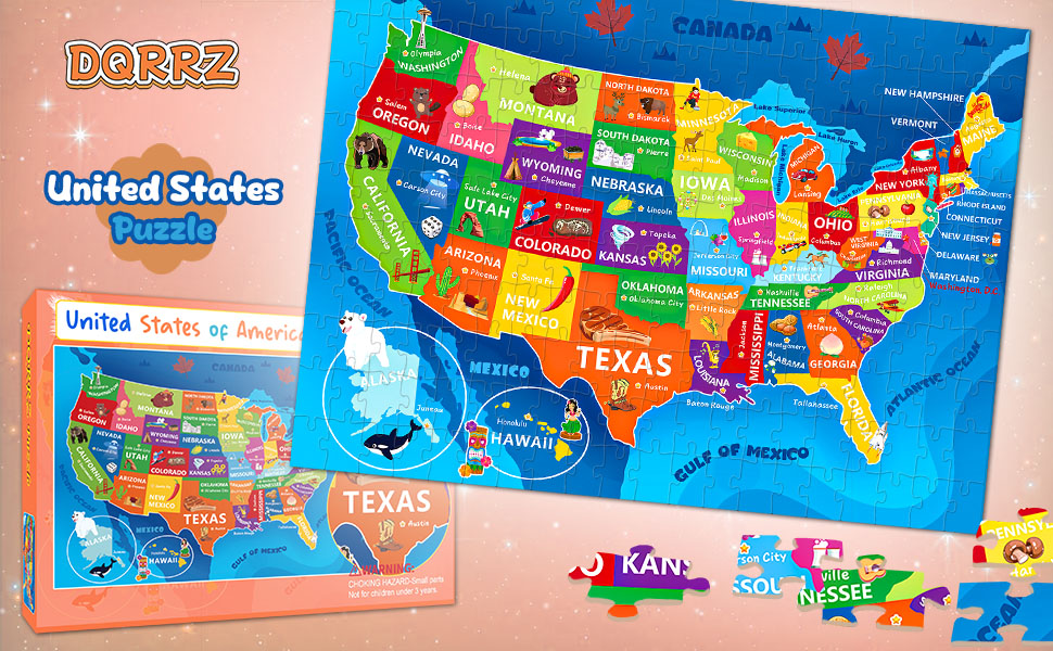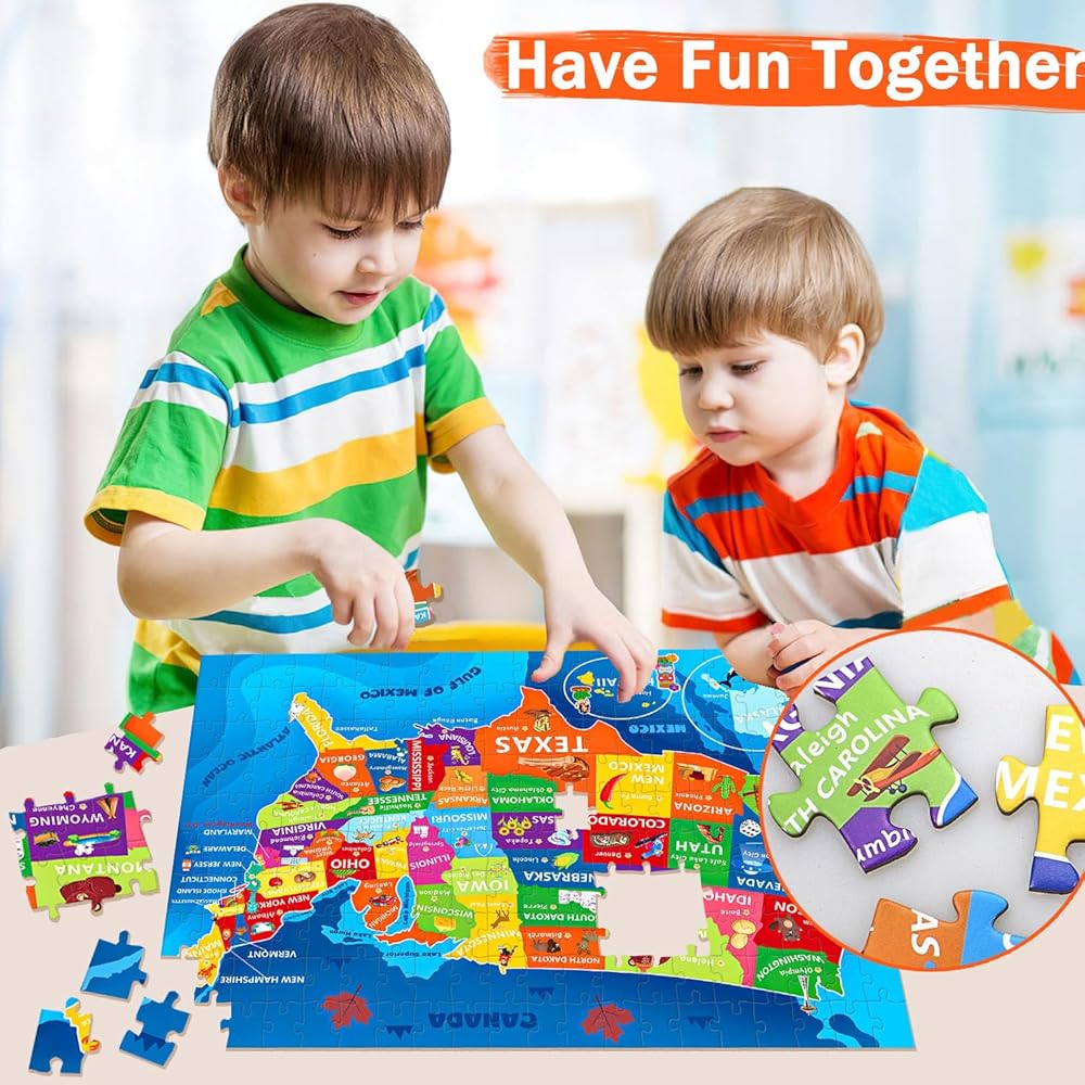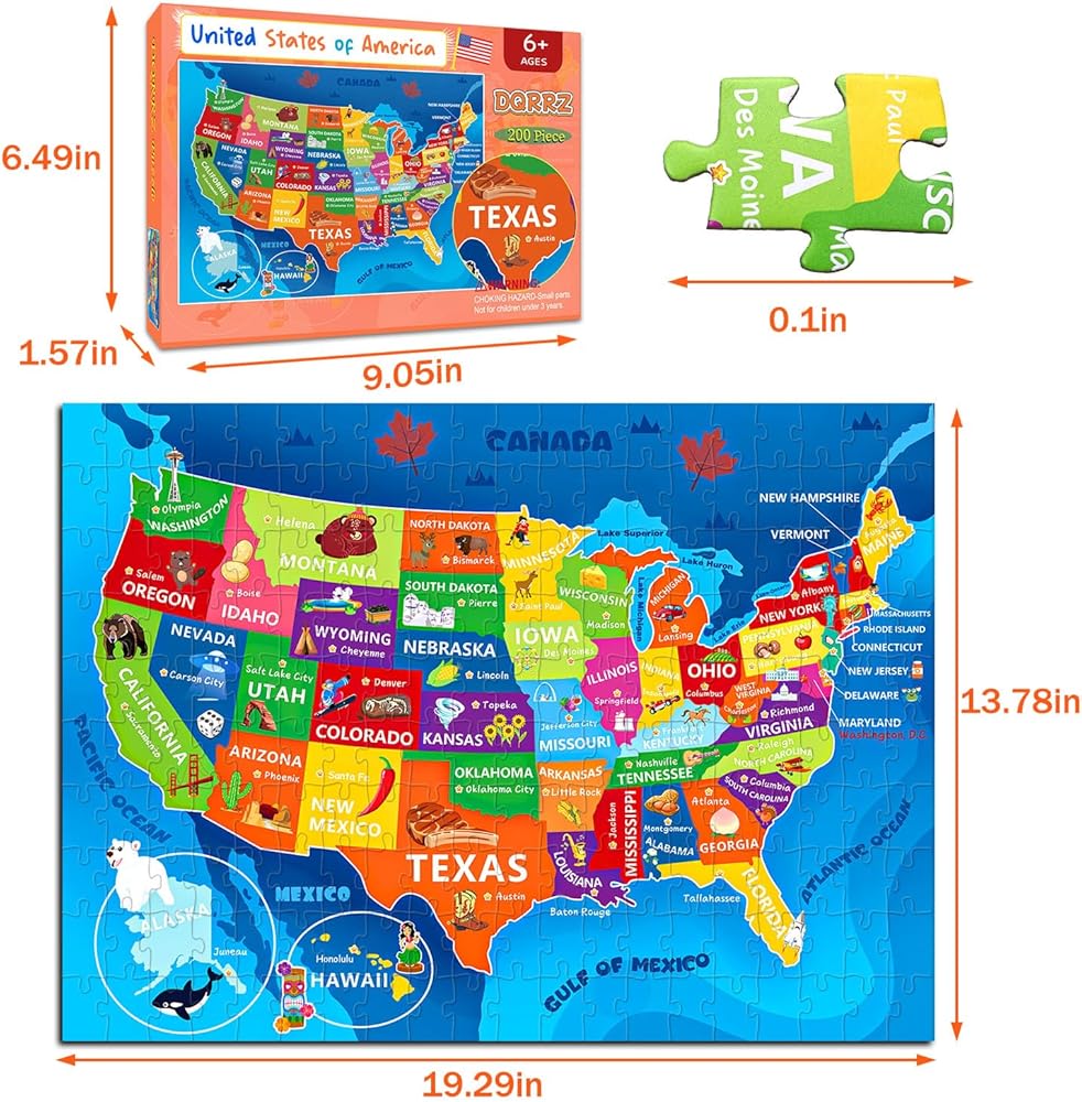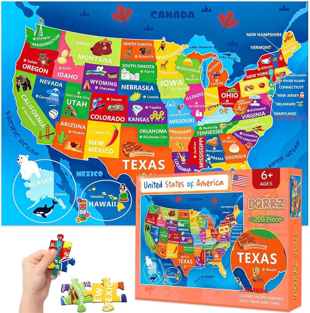 لغز خريطة الولايات المتحدة للأطفال الذين تتراوح أعمارهم بين 6-8 8-10 10-12 - 200 قطعة من الصور المقطوعة الأرضية مع ملصق - منشار جغرافي تعليمي للولايات المتحدة الأمريكية مع 50 دولة وعواصم - لغز خريطة كبير هدية STEM للأولاد والبنات