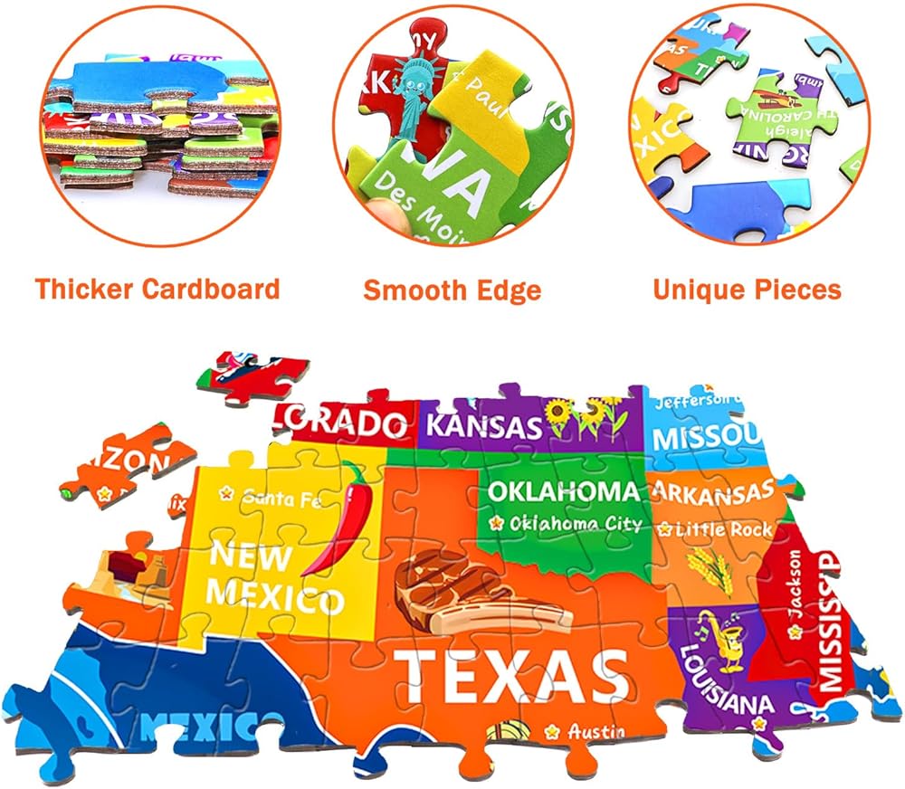 أداة تعليمية شاملة للجغرافيا: استكشف جميع الولايات والعواصم والمعالم الخمسين باستخدام لغز خريطة الولايات المتحدة المفصل هذا. إنها لعبة تعليمية مثالية للعلوم والتكنولوجيا والهندسة والرياضيات لتعزيز المعرفة الجغرافية والوعي المكاني للأطفال الذين تتراوح أعمارهم بين 6-8 و8-10 و10-12 سنة. تساعد أحجية خريطة الولايات المتحدة الأمريكية المستكشفين الصغار على اكتشاف جمال أمريكا من خلال اللعب.