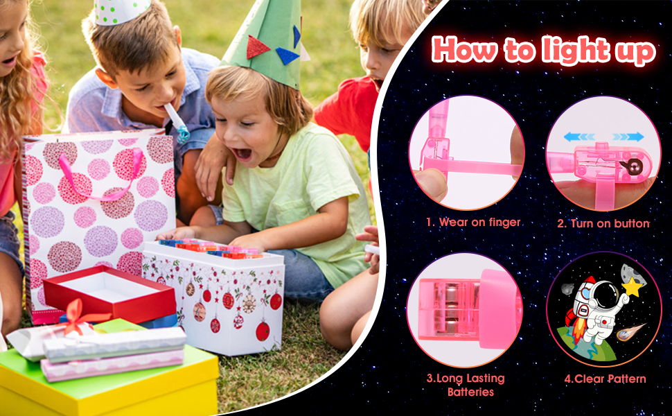 السلامة والتطبيق العملي هما أهم أولويات ألعاب الأطفال! مصابيح الأصابع هذه مصنوعة من بلاستيك غير سام وعالي الجودة وخفيف الوزن ومريح في الارتداء وقوي بما يكفي لتحمل اللعب الخشن.