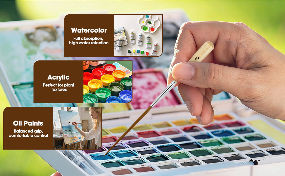 🖐️ مقبض قصير مريح - راحة تتيح لك الطلاء لفترة أطول صُممت فرش التحديد هذه (فرشاة تحديد واحدة موثوقة أيضًا) خصيصًا للأعمال التفصيلية القريبة، بمقبض خشبي قصير مريح. يوفر شكله الدائري الأملس توازنًا مثاليًا وقبضة طبيعية، حتى لا تتشنج يدك أو تتعب أثناء الجلسات الطويلة. ستحصل على تحكم حاد بالليزر من أجل تحديد دقة الفرشاة، ومخطط التمرير، والتفاصيل الصغيرة - سهل الاستخدام للمحترفين والهواة الجادين الذين يحبون فرشاة الألوان المائية، أو فرش طلاء الأكريليك، أو فرش الألوان المائية الاحترافية. يجب اقتناؤه لأي شخص يهتم بفرش الطلاء عالية الجودة.