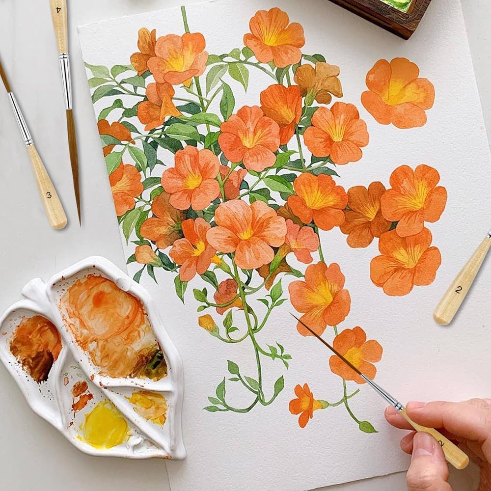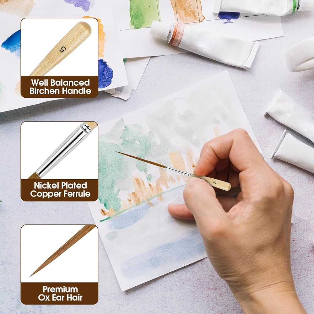 🎨 شعر أذن الثور الفاخر - فرش الطلاء المفضلة للحصول على التفاصيل صُنعت فرش التحديد هذه (وفرشاة تحديد العيون سهلة الاستخدام ومستقلة) من شعر أذن الثور الداخلي من الدرجة الأولى، وهي ما يصل إليه الفنانون المحترفون. إنها تحافظ على شكلها كالحلم، وتقاوم الانحناء، وتمتص الكمية المناسبة من الطلاء للحصول على خطوط ناعمة بدون توقف - لا مزيد من التوقف لإعادة التحميل في منتصف المشروع. مثالية لأعمال الفرشاة المقلمة، والتخطيط التمريري، والأنسجة الدقيقة، فهي ترقية كبيرة من فرشاة الألوان المائية الأساسية، وفرش الطلاء بالألوان المائية، وفرش الطلاء الأكريليك - مما يتوافق مع أداء فرش الألوان المائية المتطورة الاحترافية.