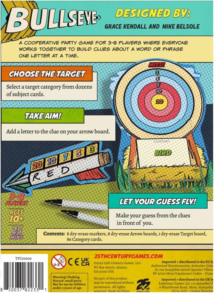 Easy to learn and endlessly replayable, Bullseye blends deduction, creativity and teamwork, making it perfect for parties, family gatherings, classrooms and casual game nights.