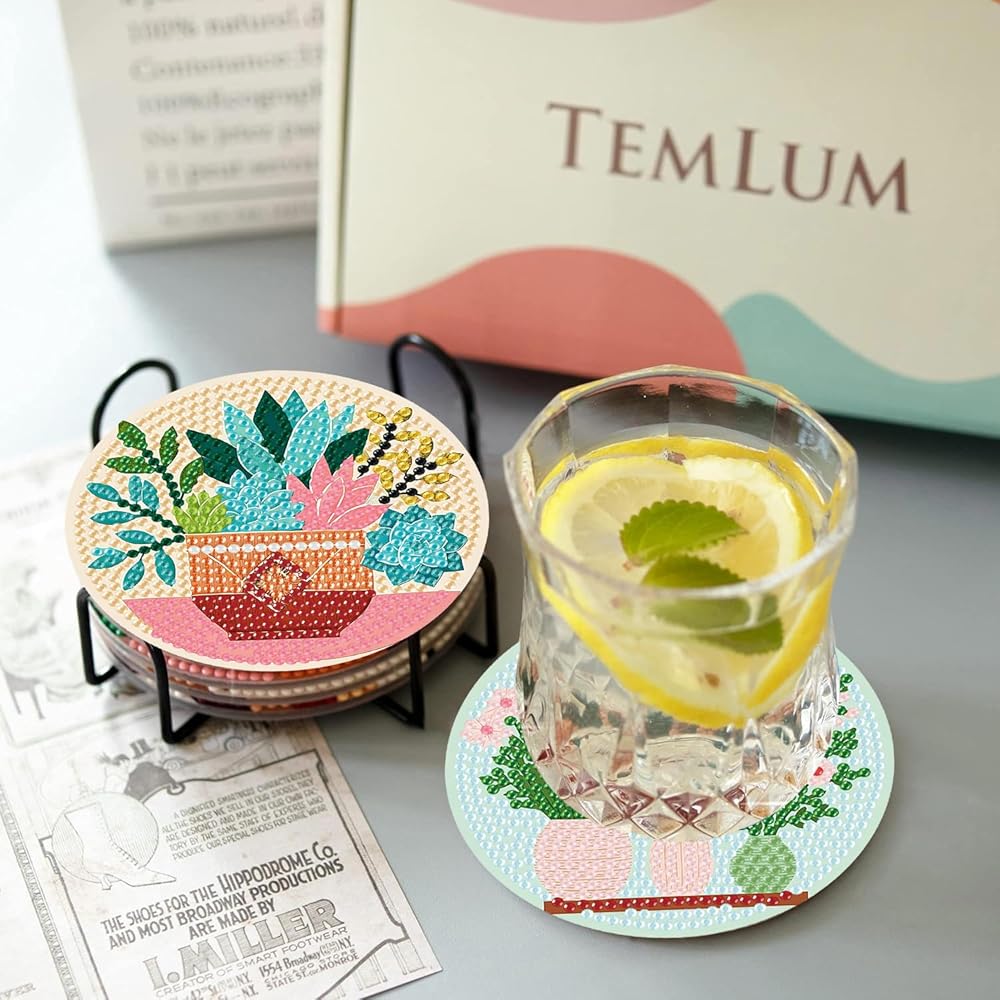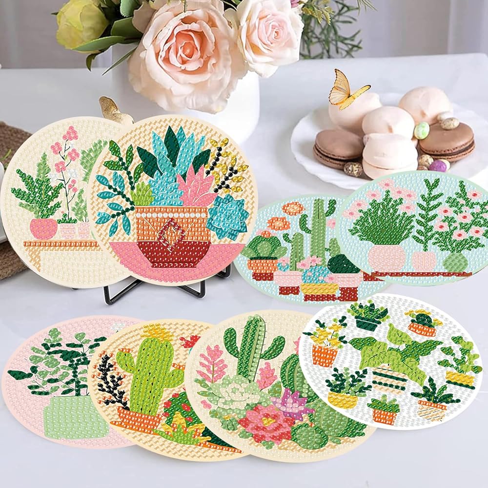 Diamond Art Coasters Kits, 8 Pieces Abstract Plants Diamond Painting Coasters with Holder, Diamonds Art Painting Kits for Adults, 5D DIY Wooden Coaster for Gift