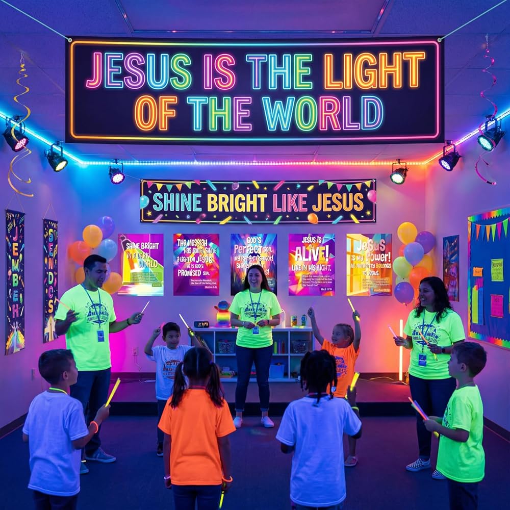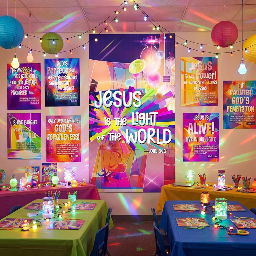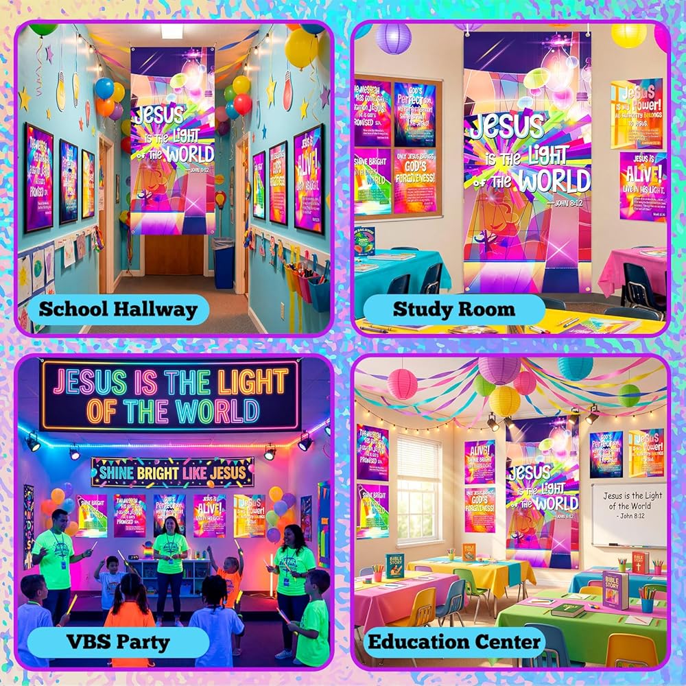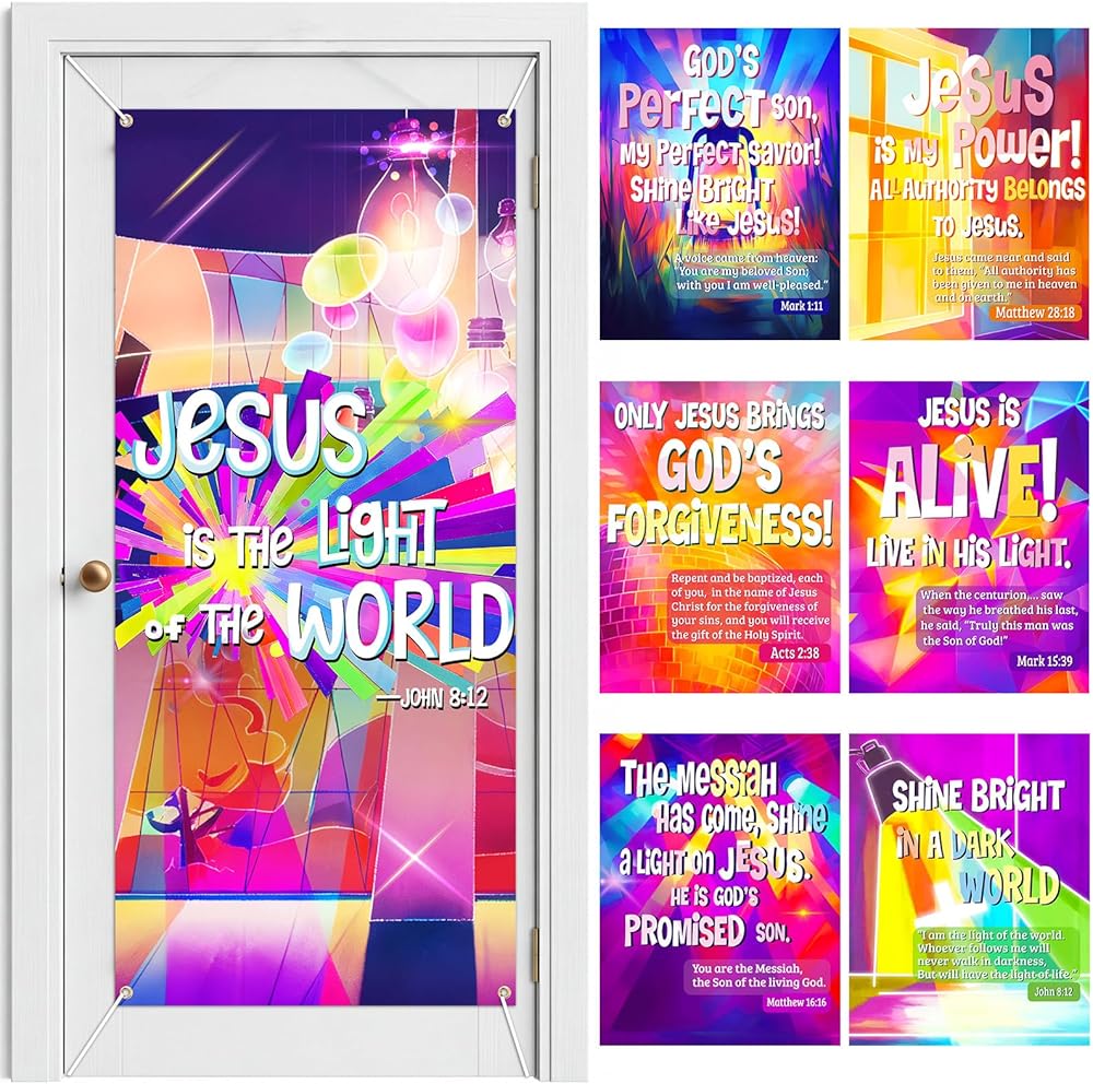 The VBS front door decoration have holes on the 4 corners come with hanging rope, you can easily hang it and display it anywhere you want as holiday photo booth props or VBS party background, easy to create an religious atmosphere