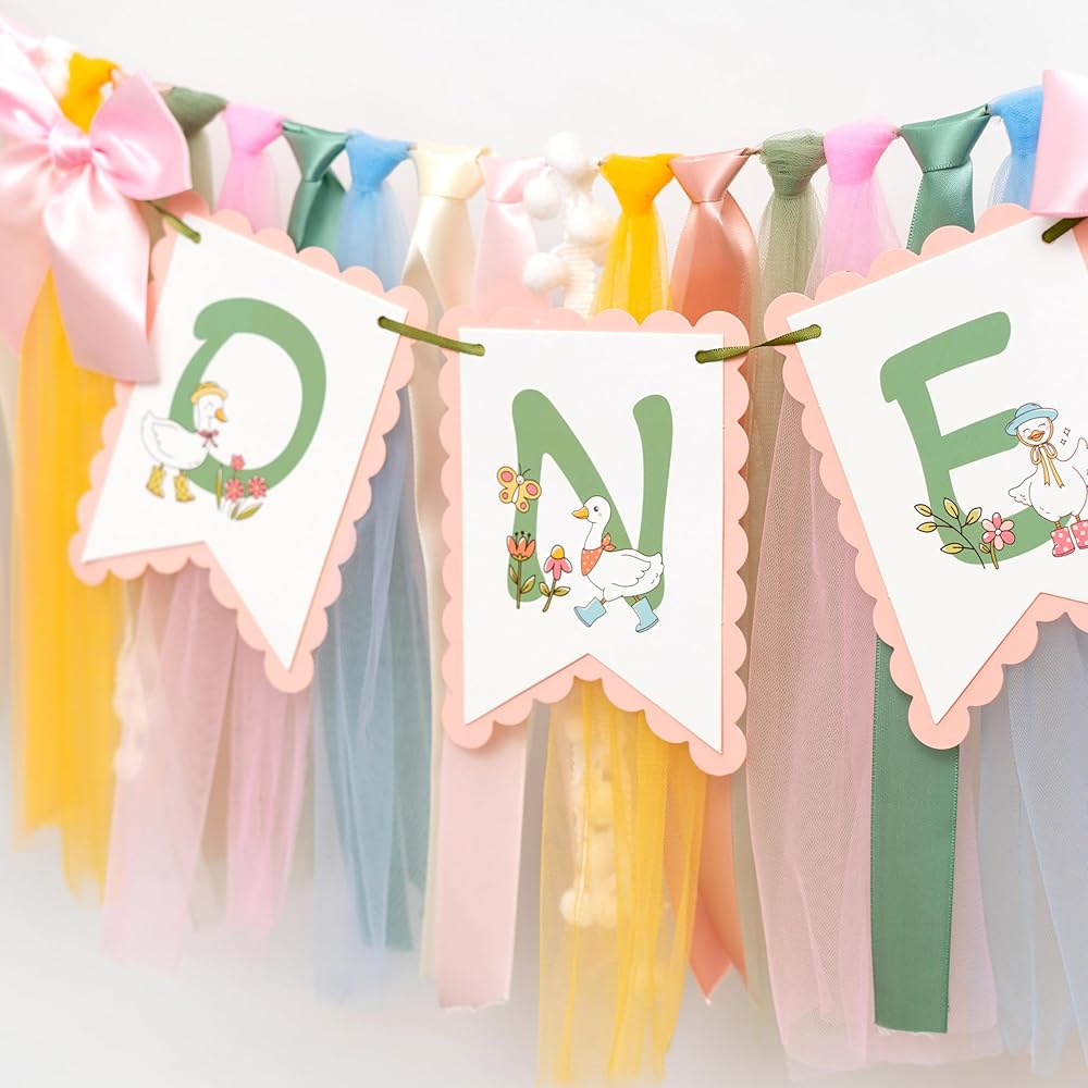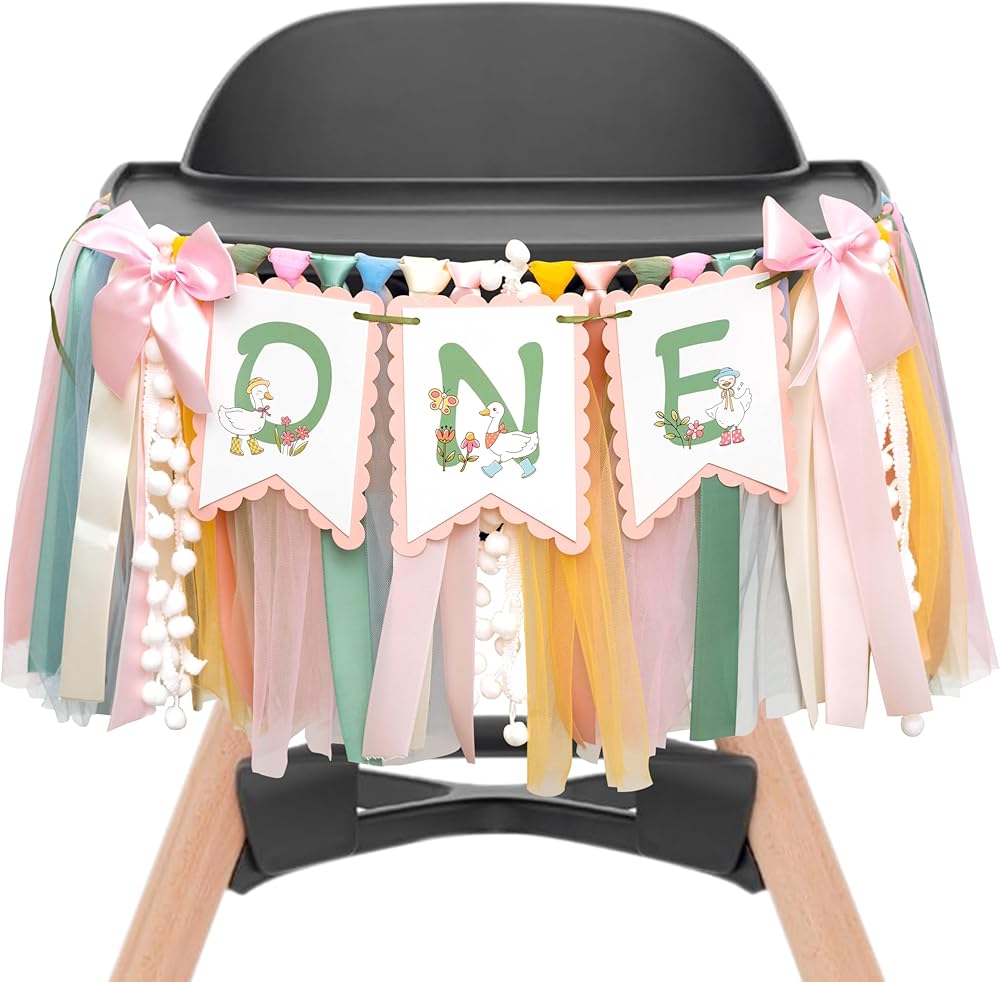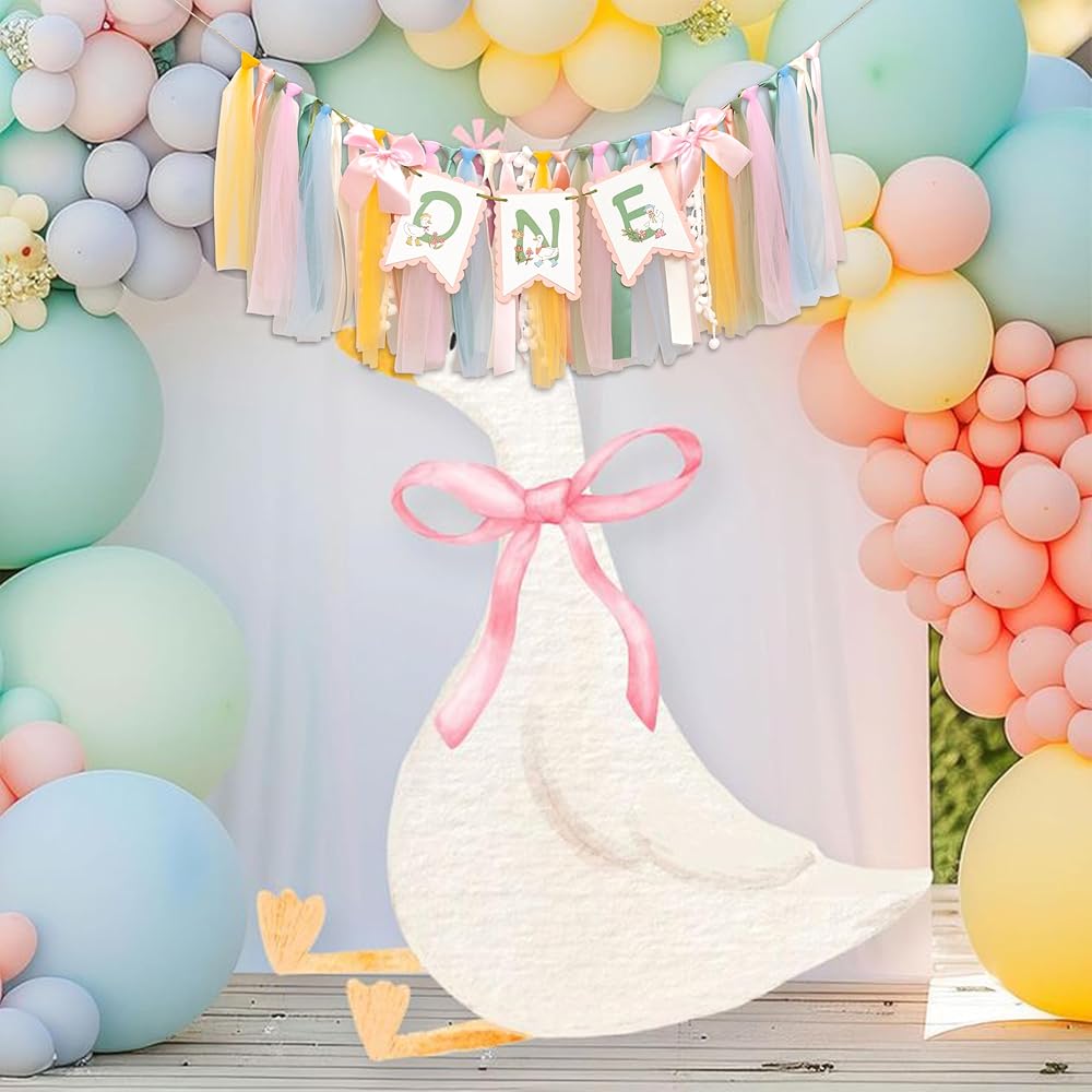 موضوع الإوزة الرائع: تم تصميم لافتة الكرسي العالي هذه بموضوع إوزة مرحة، وتتميز بإوزة بيضاء ساحرة وفيونكة وردية، وهي مثالية لإضافة لمسة من الغرابة إلى عيد ميلاد طفلك الأول