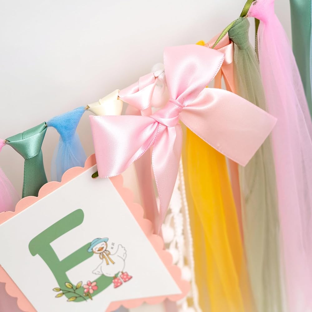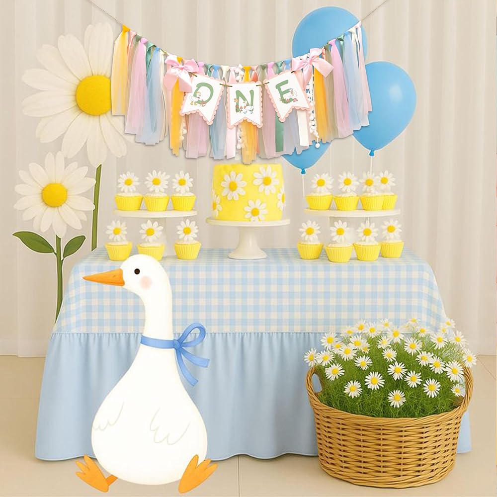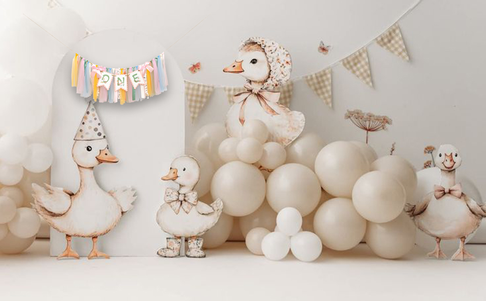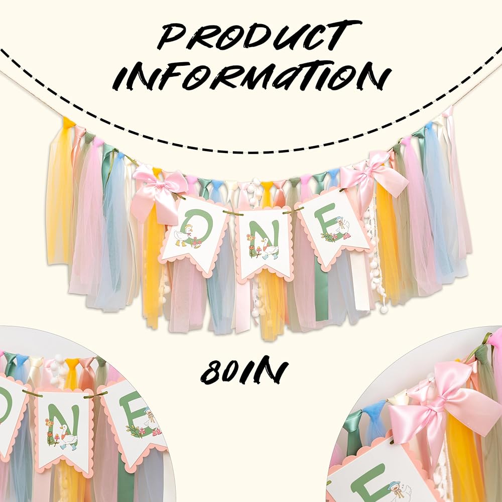 موضوع الإوزة الرائع: تم تصميم لافتة الكرسي العالي هذه بموضوع إوزة مرحة، وتتميز بإوزة بيضاء ساحرة وفيونكة وردية، وهي مثالية لإضافة لمسة من الغرابة إلى عيد ميلاد طفلك الأول