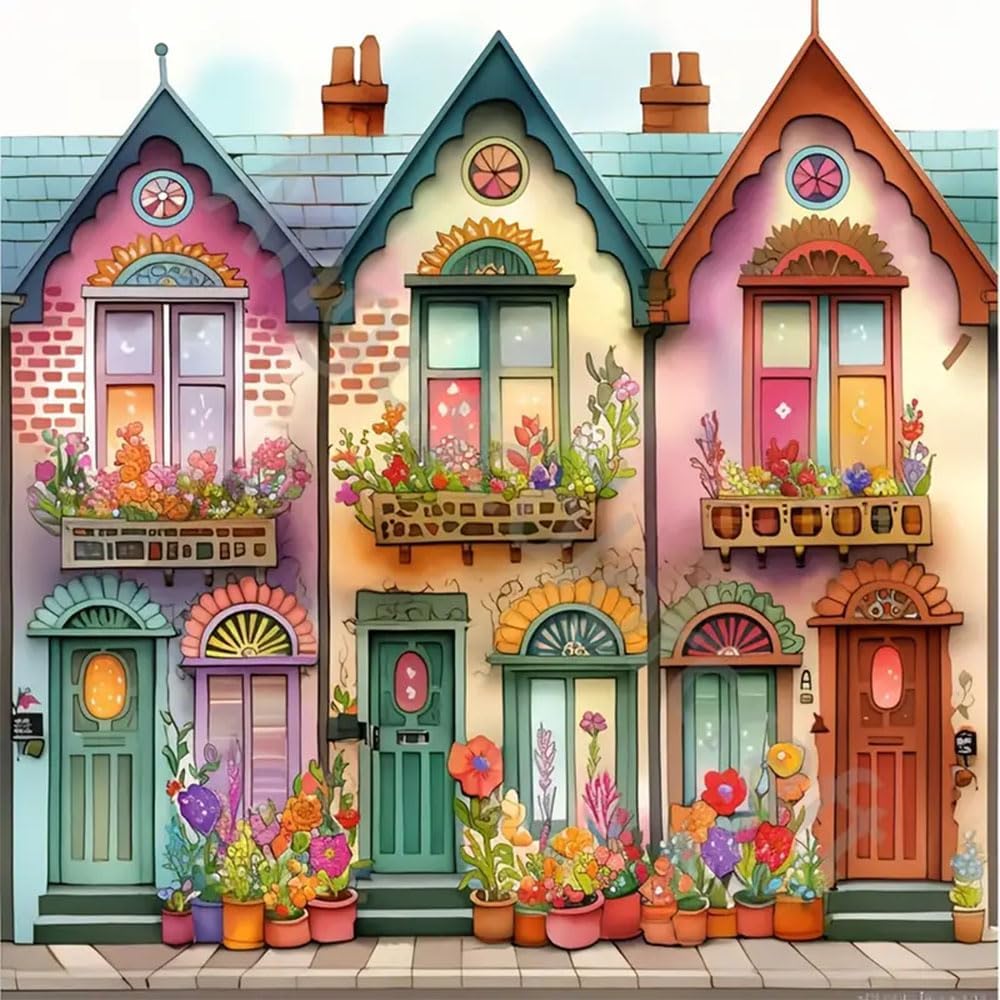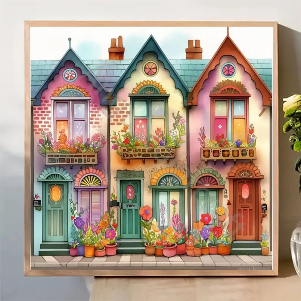 Diosedyer 5D الحفر الكامل غريب الأطوار منازل الشرفة طقم الطلاء الماسي - أكواخ ملونة مملوءة بالزهور، فن كريستال DIY لديكور المنزل، حرفة منزلية للبالغين والأطفال 11.8 × 11.8 بوصة