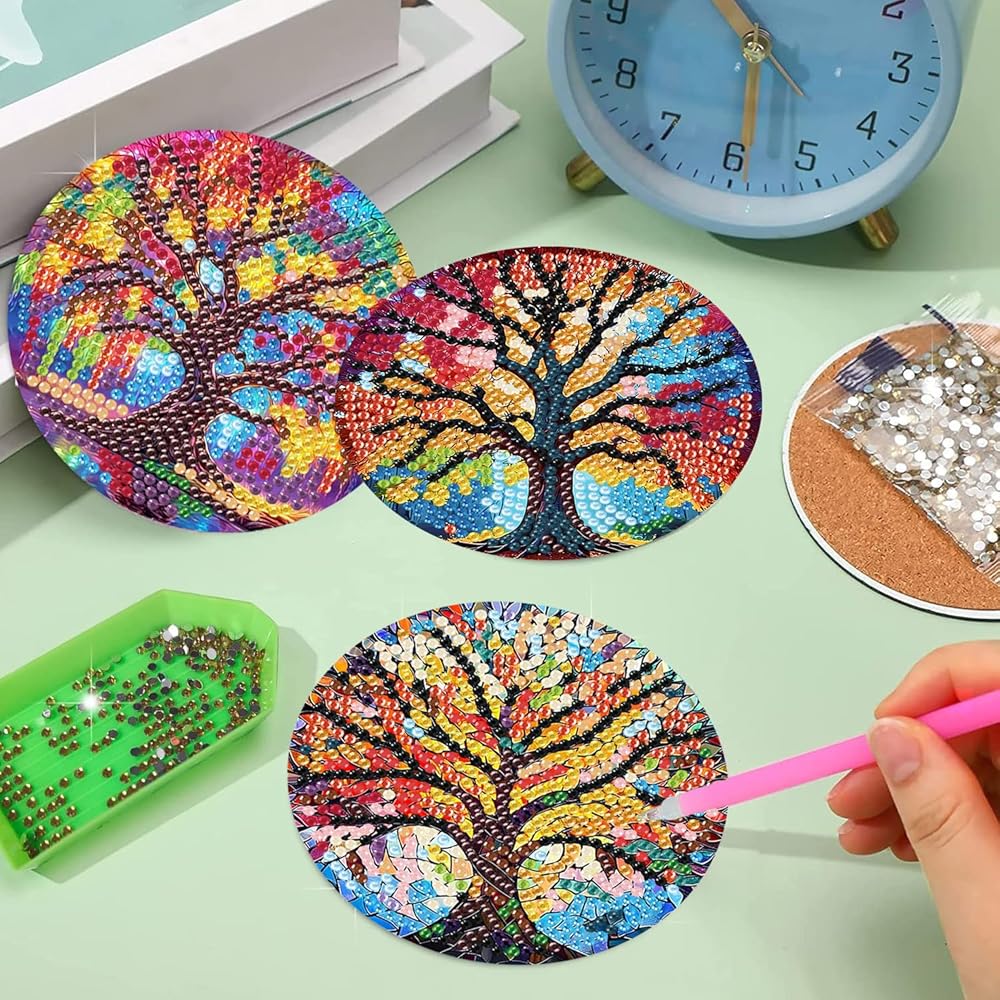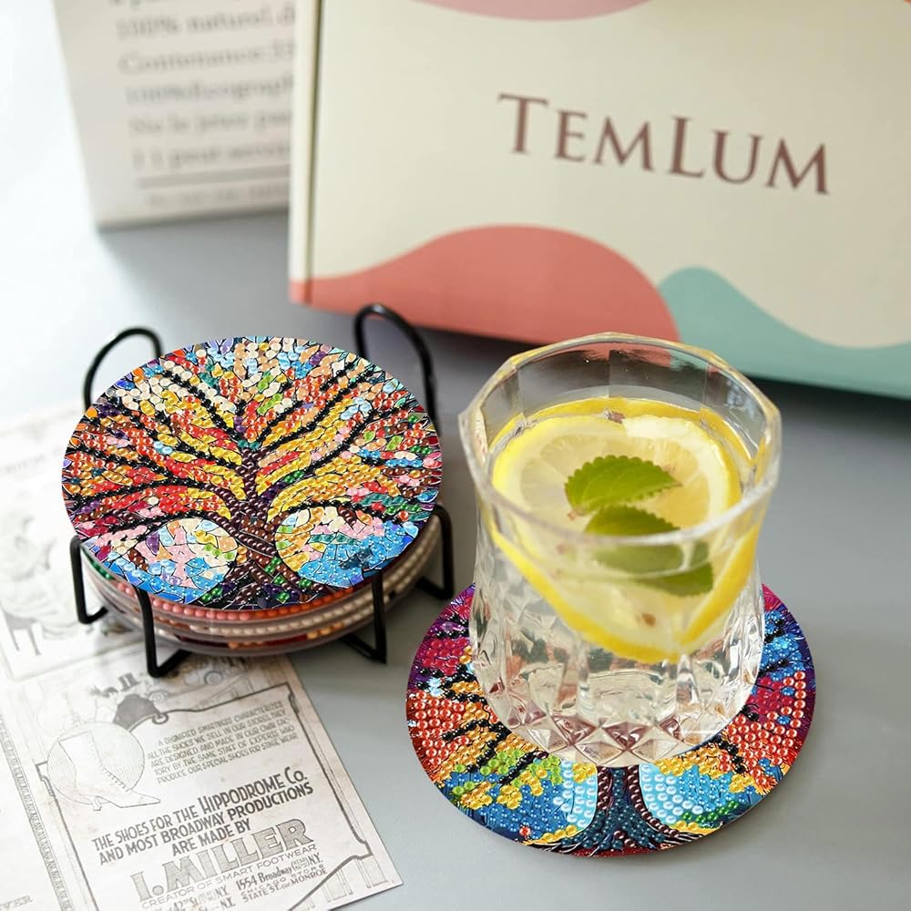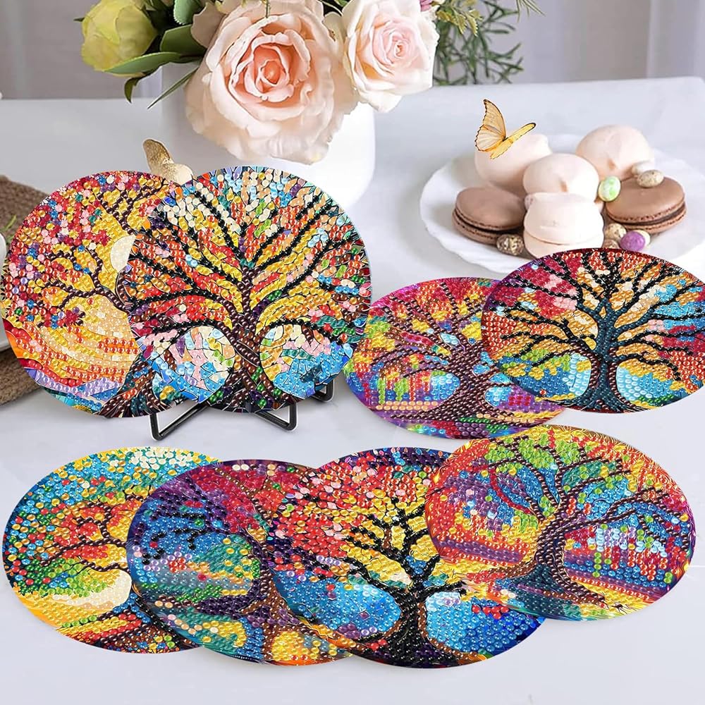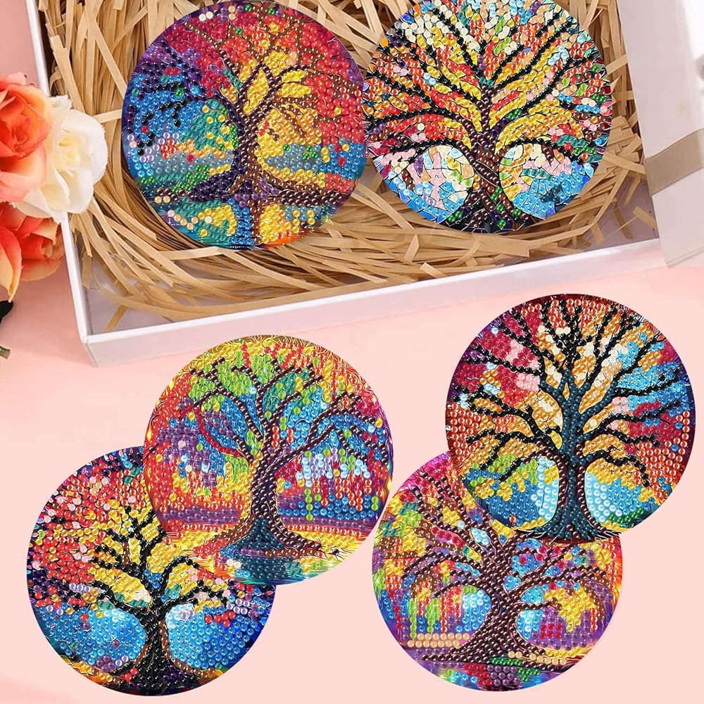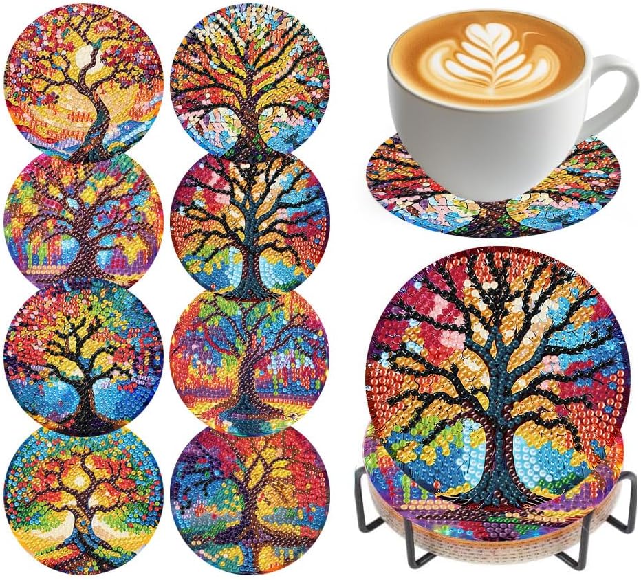 مجموعات قواعد الأكواب الفنية الماسية، 8 قطع من قواعد الأكواب الماسية مع حامل، مجموعات قواعد الأكواب الفنية الماسية لشجرة الحياة للبالغين، قاعدة خشبية خماسية الأبعاد DIY للهدايا