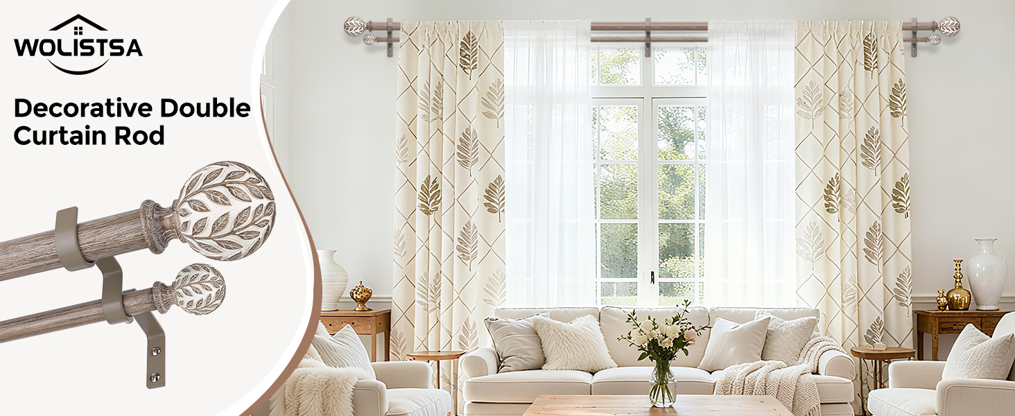 قضيب ستارة مزدوج، قضبان ستائر مزدوجة طويلة مزخرفة من خشب بوهو للنوافذ من 84 إلى 120 بوصة، قضيب مزدوج عالي التحمل قابل للتعديل، تصميم نهائي مصنوع يدويًا من أوراق الخشب المحببة