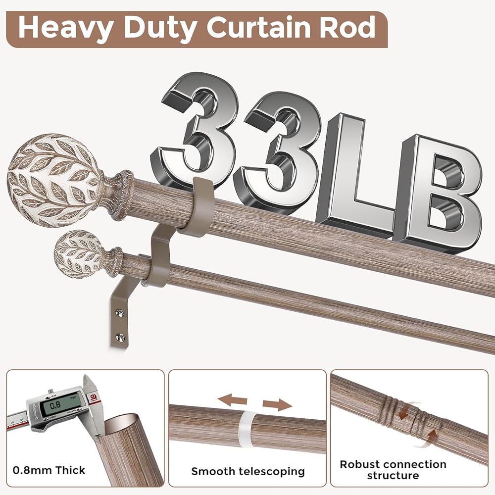 [شديدة التحمل ومصممة لتدوم طويلاً] قضبان الستارة الريفية المزدوجة الخاصة بنا مصنوعة من الفولاذ الكربوني عالي الجودة (0.5% كربون). يبلغ قطر القضيب الأمامي لقضبان الستارة ذات الطبقة المزدوجة 1 بوصة، وقطر القضيب الخلفي 5/8 بوصة، وسمك القضيب 0.8 ملم. يمكن لهذا التصميم لقضيب معالجة النوافذ القوي أن يتحمل وزنًا يصل إلى 33 رطلاً.