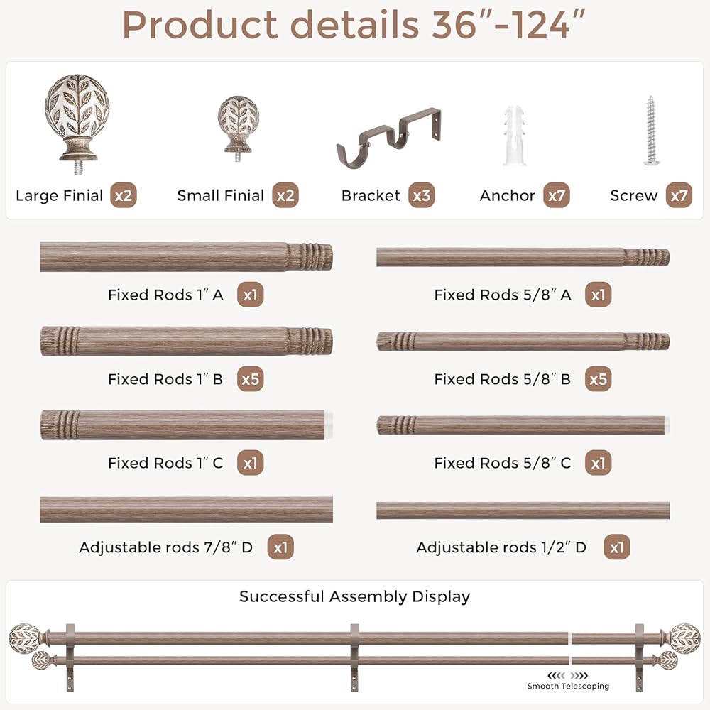 [أبعاد القضيب ومحتويات العبوة] يتميز قضيب الستارة ذو الطبقة المزدوجة للديكور البوهيمي الأنيق بتصميم قابل للتعديل يمتد من 36 إلى 124 بوصة (3 إلى 10.3 قدم) ويناسب النوافذ بعرض 30 إلى 120 بوصة (2.5 إلى 10 قدم). تتضمن حزمة قضيب الستارة المزدوج الطويل 14 قضيبًا ثابتًا مع قضيبين قابلين للتعديل مثبتين مسبقًا بالداخل، بالإضافة إلى 4 تيجان، و3 أقواس تثبيت، و7 مثبتات حائط، و7 براغي.