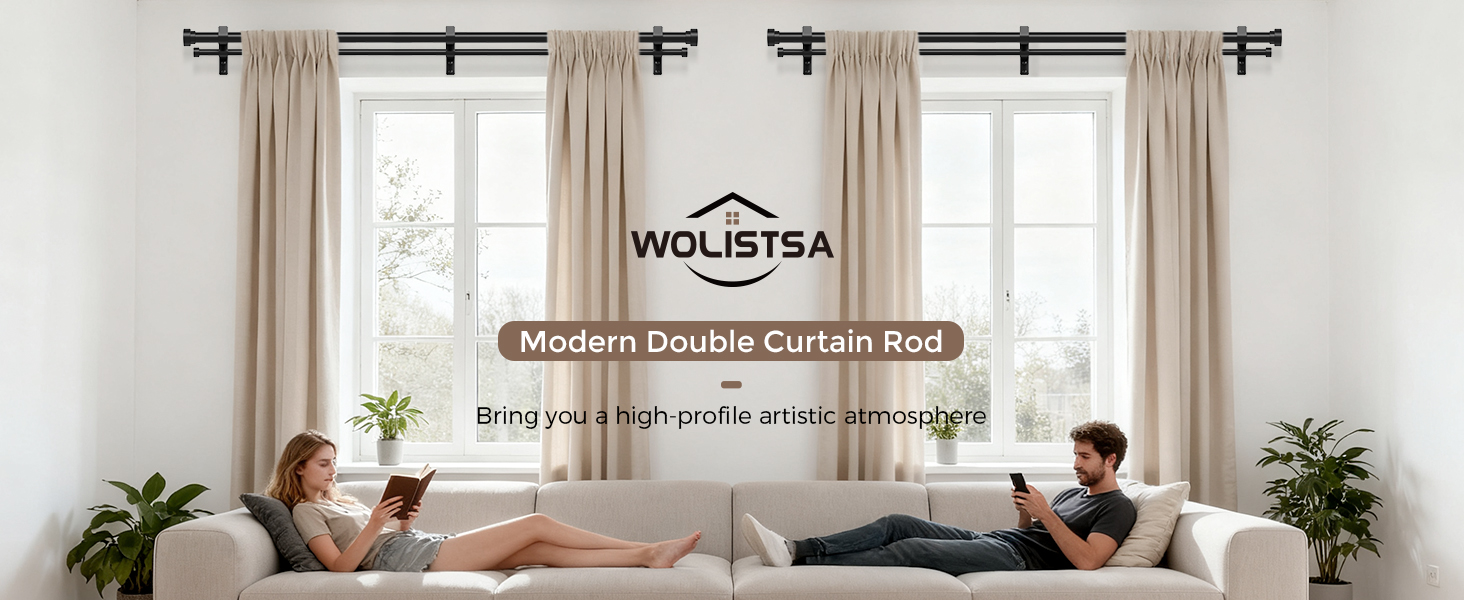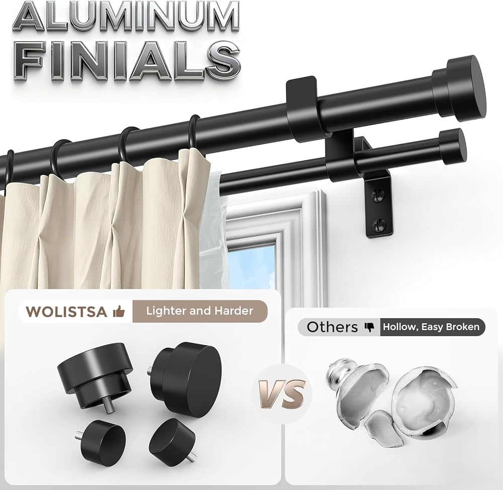 [BLACK DOUBLE CURTAIN ROD]: Wolistsa double curtain rods are crafted by professional designers, featuring a modern design that combines practicality with aesthetics. Unlike flimsy plastic finials, our modern finials use premium aluminum alloy, manually cut, meticulous grinding and multi-level polished, and adopt high-temperature curing coating, the surface is smooth, clean, round to create a perfect touch and texture with scratch-resistant