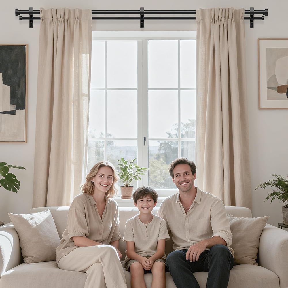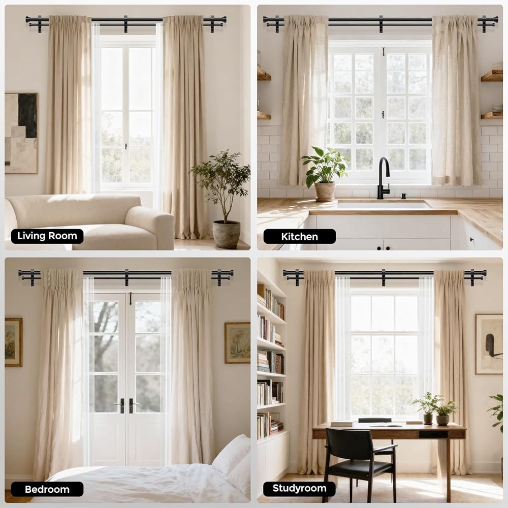 [LENGTH ADJUSTABLE CURTAIN ROD]: Our long double curtain rod is designed with one side retractable, just adjust the length of the rod, it can be easily applied to all kinds of windows. Each double window curtain rod is treated with a precision baking process, the surface is always smooth, and the grommets won't get stuck when sliding the curtains