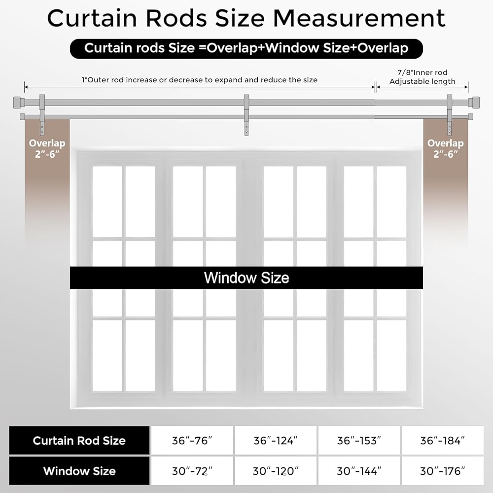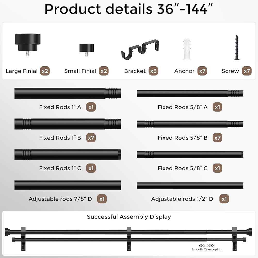 [DOUBLE CURTAIN ROD SIZE SELECTION]: The Wolistsa curtain rod double features a single side telescoping sliding construction, maximum extension length of 36 to 153 inches(3 to 12.8 feet), applicable window lengths from 30 to 144 inches(2.5 to 12 feet). This double window rod package includes 18 fixed rods, 2 adjustable telescopic rod, 4 black end cap finials, 3 brackets, 7 anchors, 7 screws