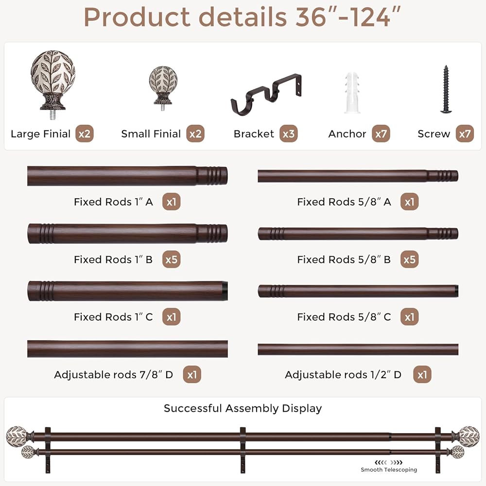 [أبعاد القضيب ومحتويات العبوة] يتميز قضيب الستارة ذو الطبقة المزدوجة للديكور البوهيمي الأنيق بتصميم قابل للتعديل يمتد من 36 إلى 124 بوصة (3 إلى 10.3 قدم) ويناسب النوافذ بعرض 30 إلى 120 بوصة (2.5 إلى 10 قدم). تتضمن حزمة قضيب الستارة المزدوج الطويل 14 قضيبًا ثابتًا مع قضيبين قابلين للتعديل مثبتين مسبقًا بالداخل، بالإضافة إلى 4 تيجان، و3 أقواس تثبيت، و7 مثبتات حائط، و7 براغي.