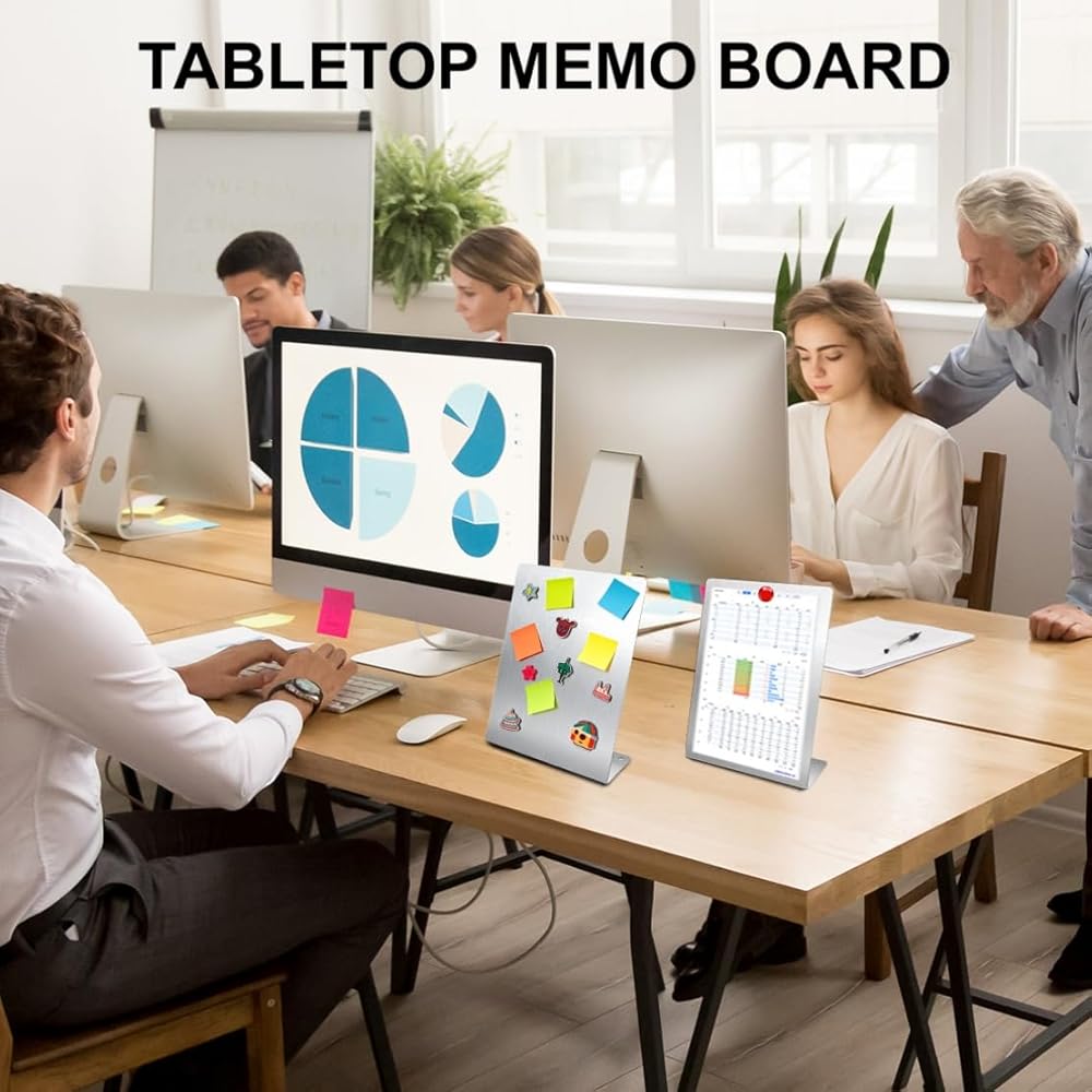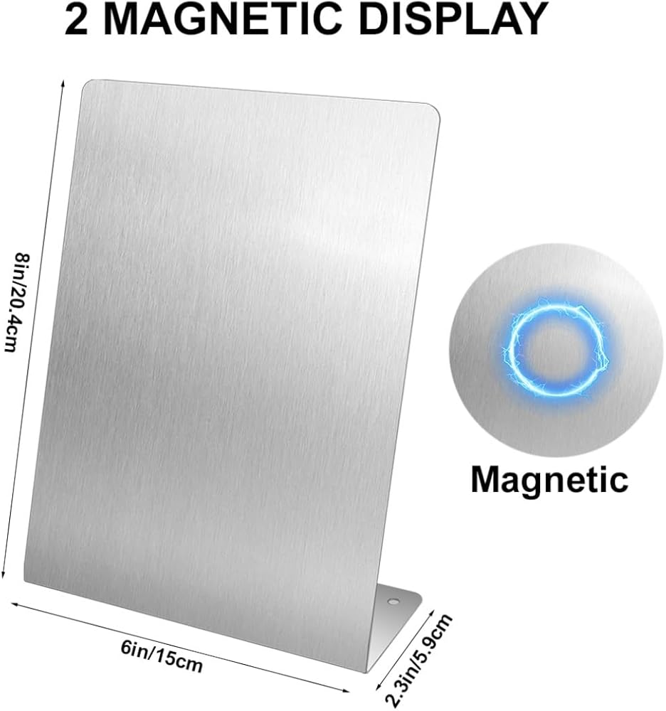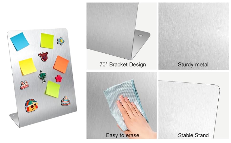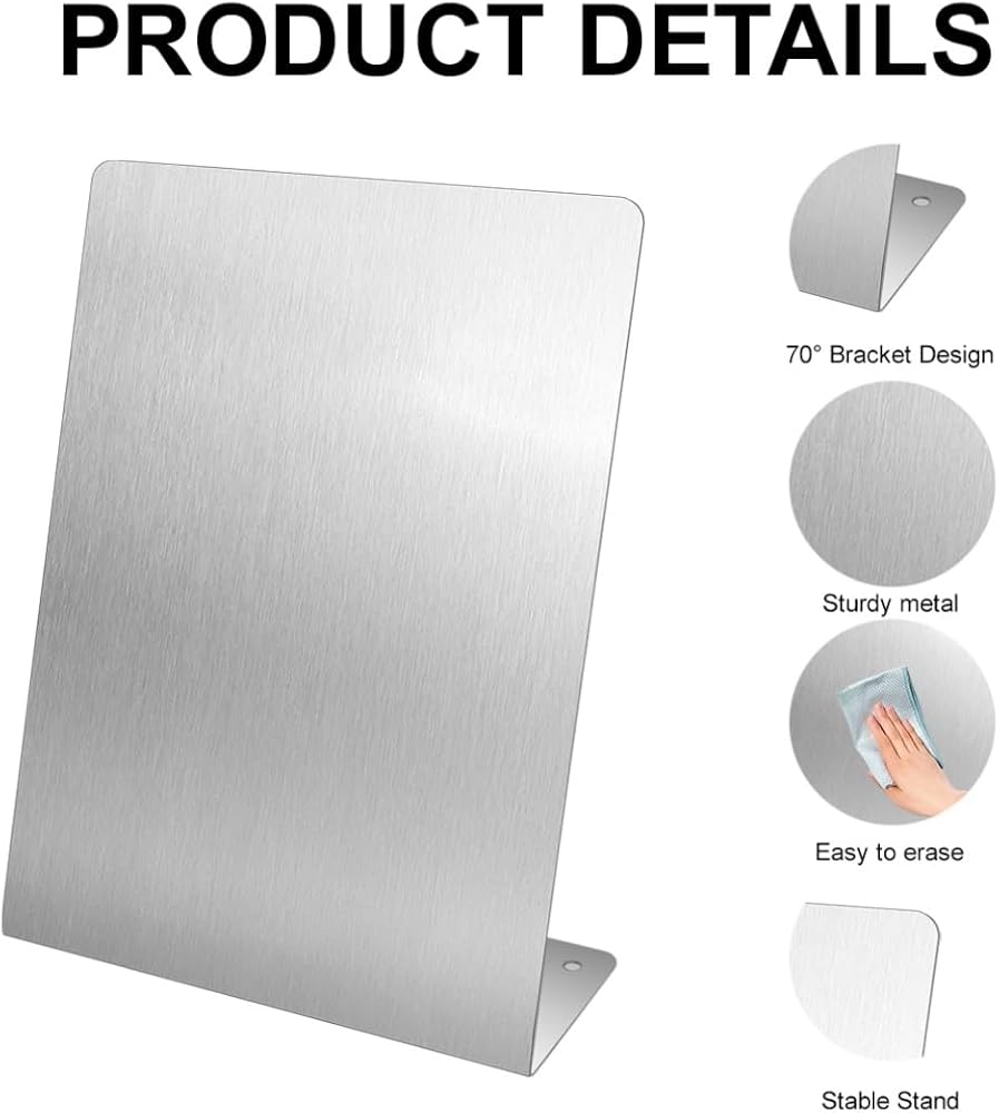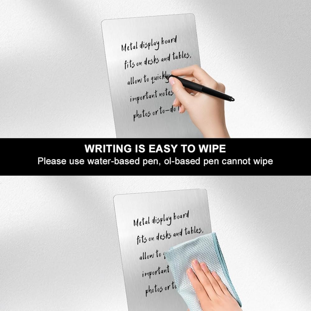 【معدن ممتاز】: لوحة المذكرات الخاصة بنا على سطح الطاولة مصنوعة من مادة قوية من الفولاذ المقاوم للصدأ، مع طلاء ناعم غير لامع لسهولة الكتابة والمسح، ولا تترك أي علامات بمجرد تنظيفها.