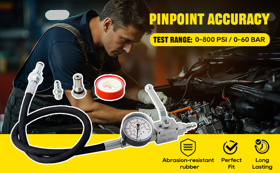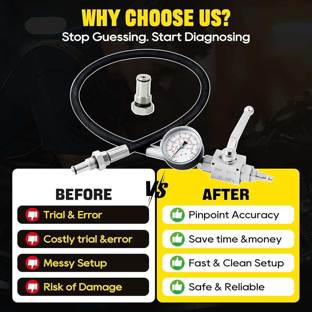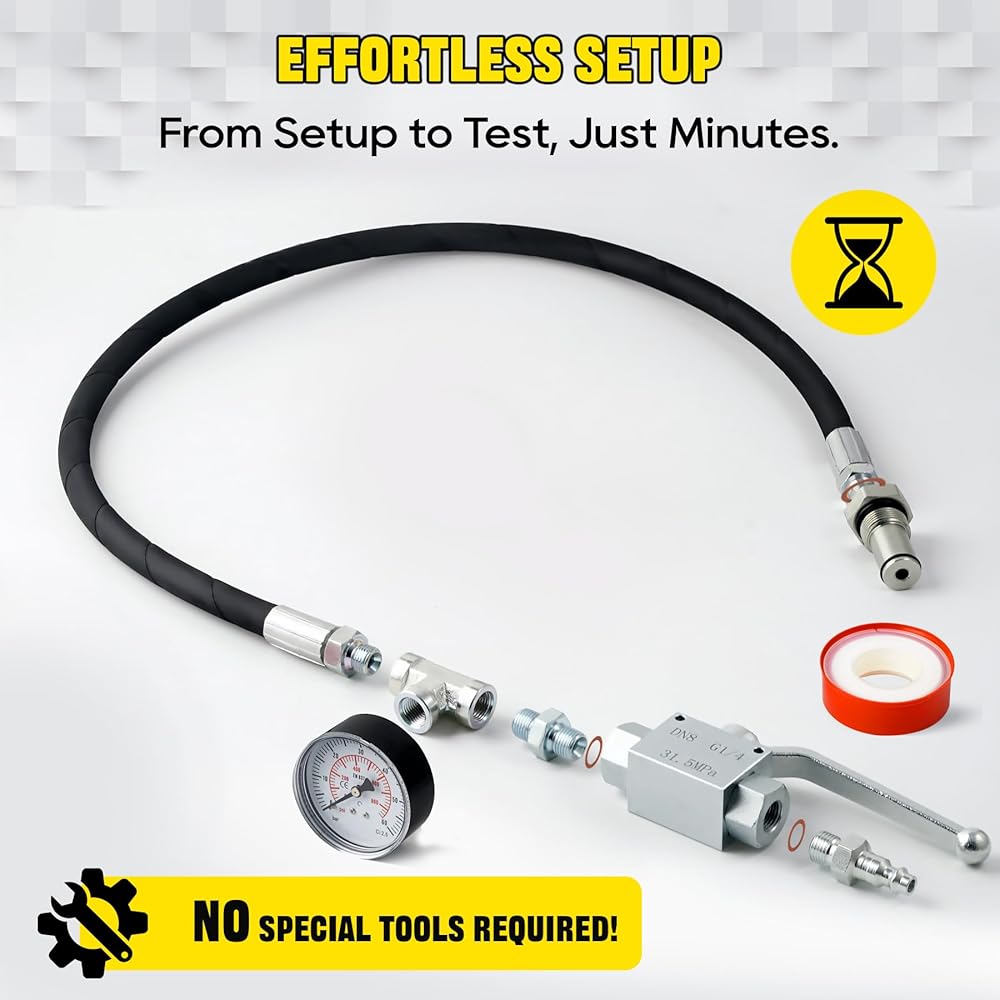 Superior Material:Built for long-term professional use! The heavy-duty hydraulic hose is rated up to 5,300 PSI, made of high-standard rubber with high-strength steel fittings for ultra-tight sealing and zero leakage. Resistant to wear, corrosion, and extreme pressure, this ipr air test tool outperforms ordinary testers, standing up to daily workshop use while maintaining stable performance for accurate oil system ipr air testing.